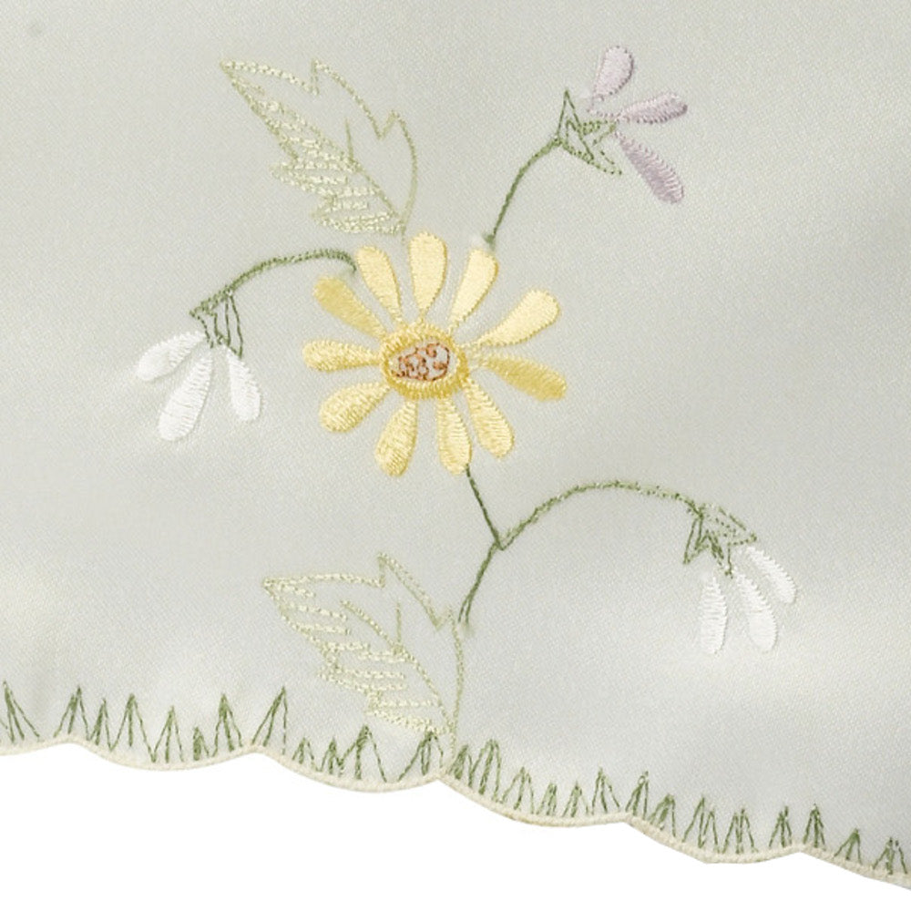 These Pure Opulence cream arm caps have a floral garden pattern with embroidered flowers and grass along the bottom scalloped hem.