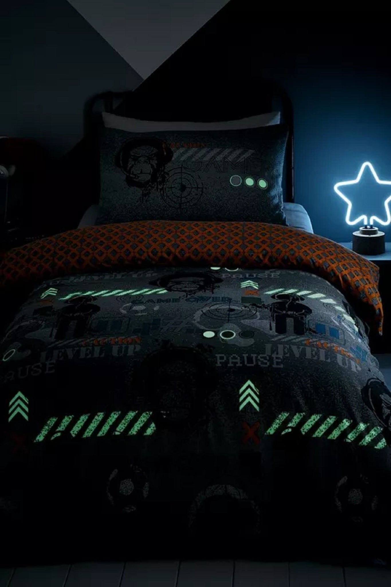 These reversible Gamer duvet cover and pillow case sets by Portfolio have a gaming slogan design that has glow in the dark images incorporated.