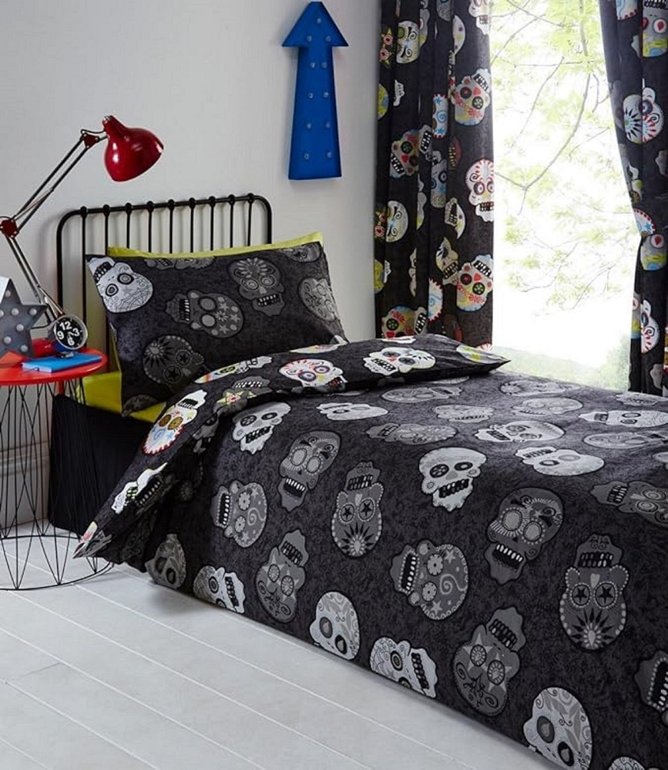 These Sugar Skulls duvet cover and pillow case sets from the Portfolio Kids Club range are reversible with one side having a colourful skulls design, the other having black and white skulls throughout.