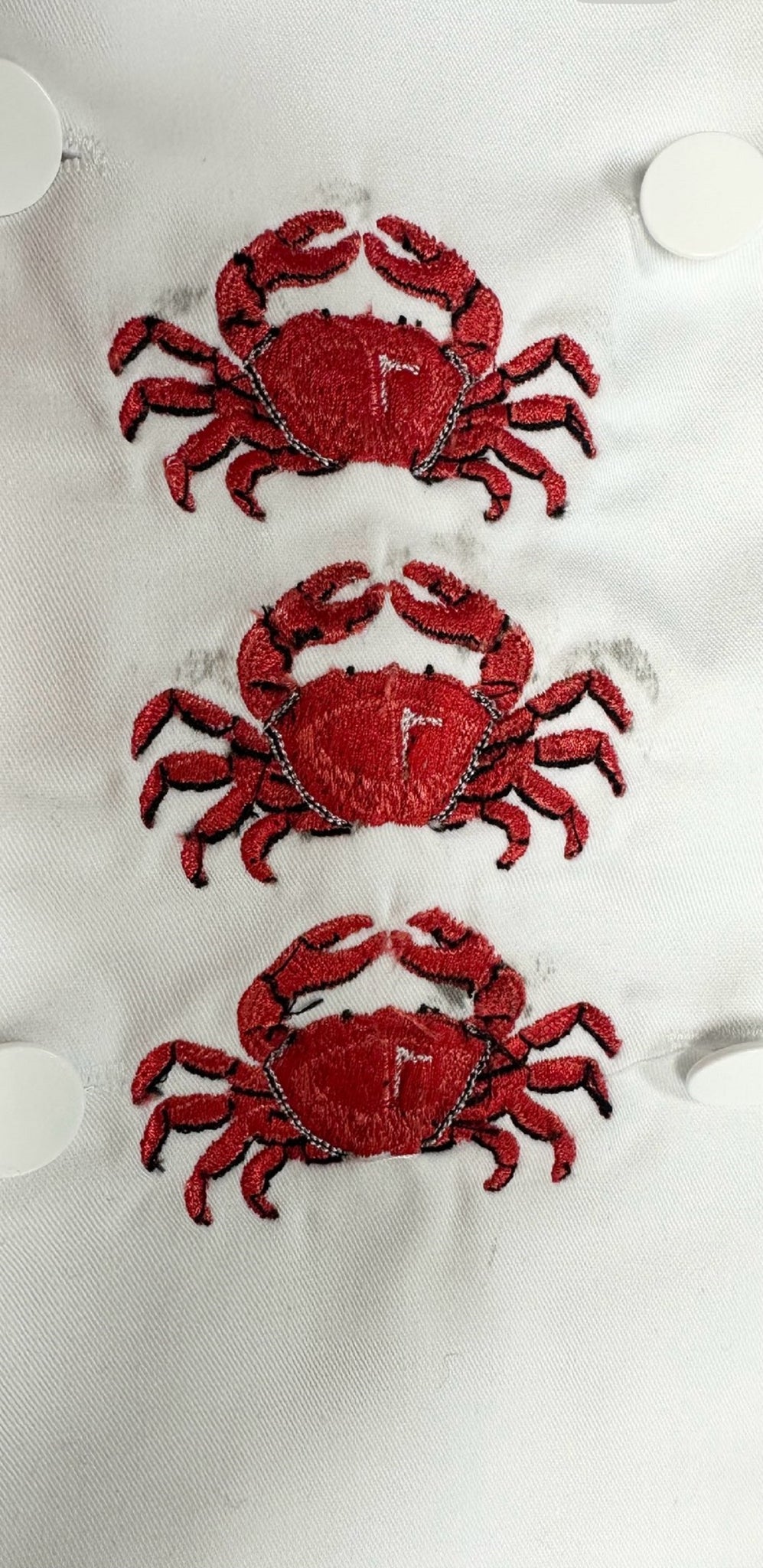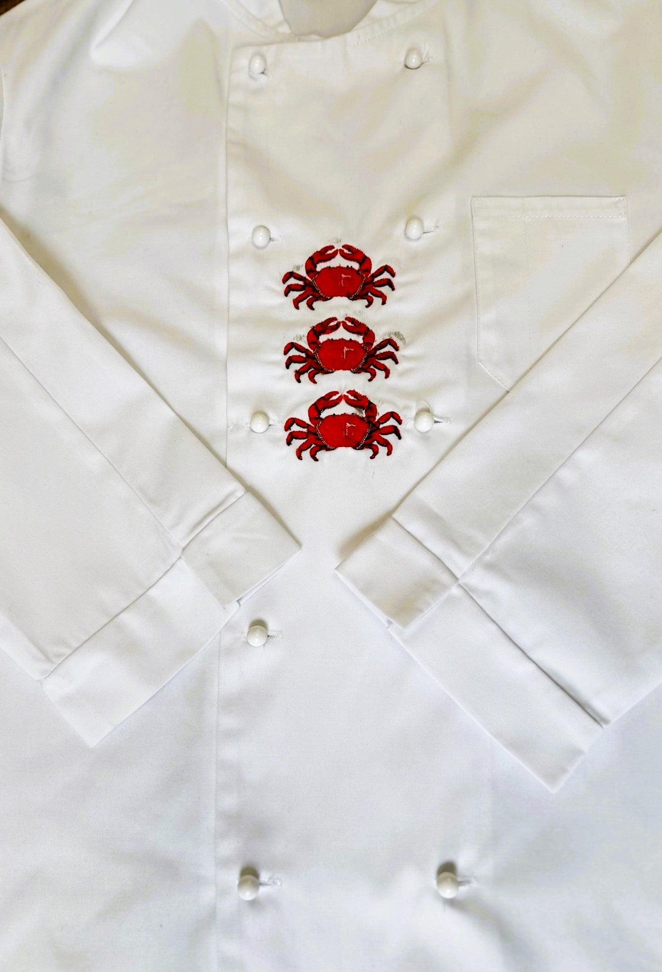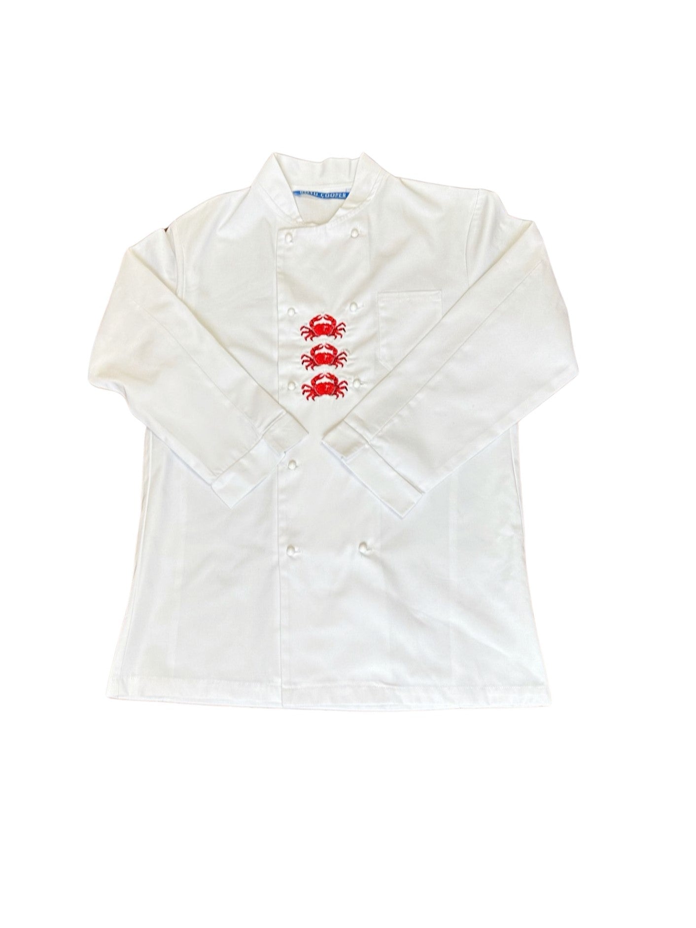 This long sleeved white chef jacket is embroidered with a 3 crab design on the front with reversible ring stud fastening, a mandarin-style collar and a breast pocket to the left.