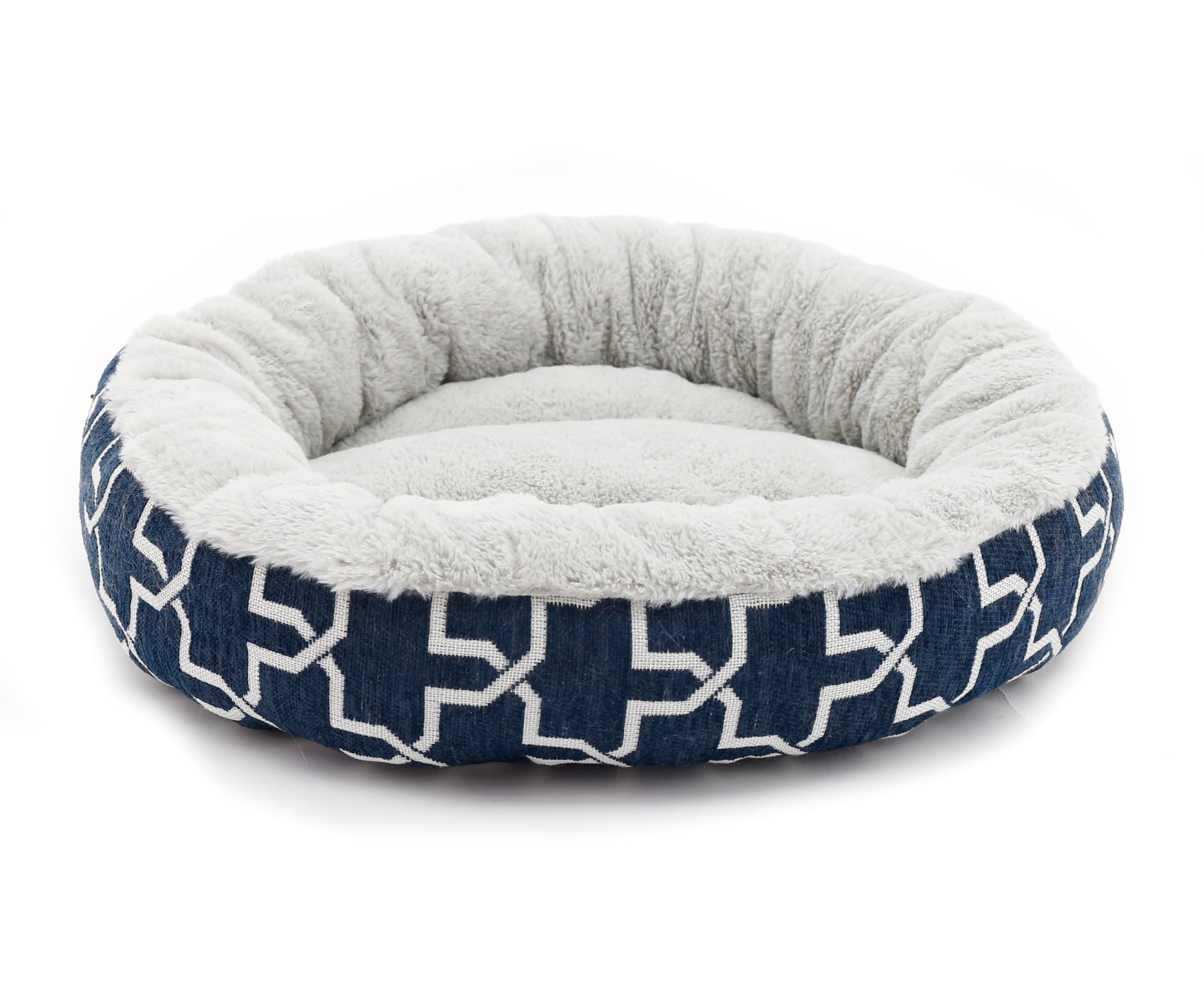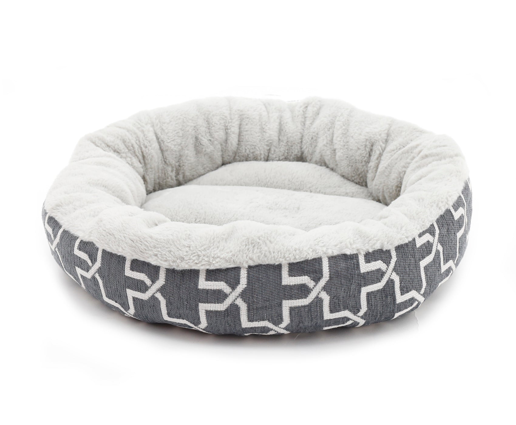 These donut style pet beds have a soft chenille outer with a modern abstract pattern and a cosy faux fur inner to give your cat or small dog warmth and comfort.