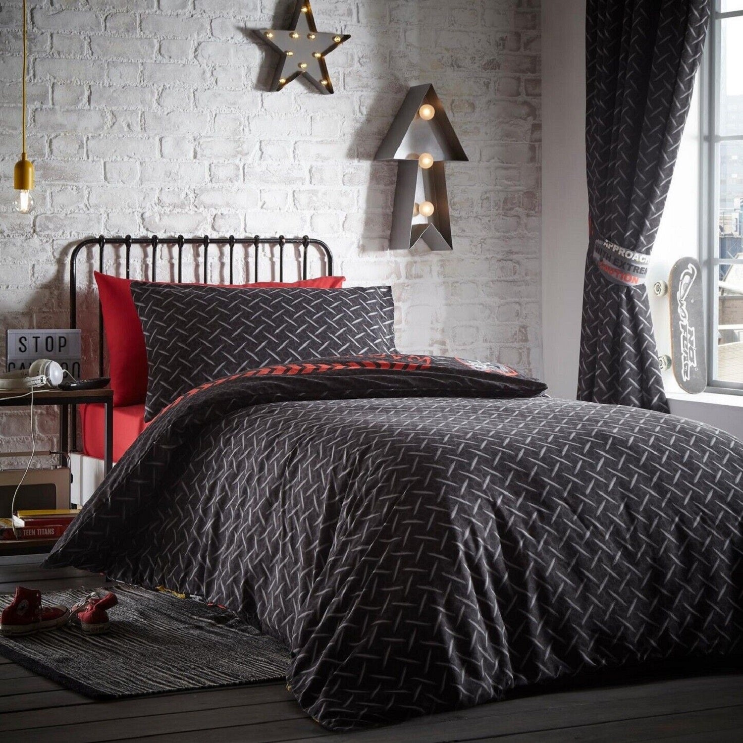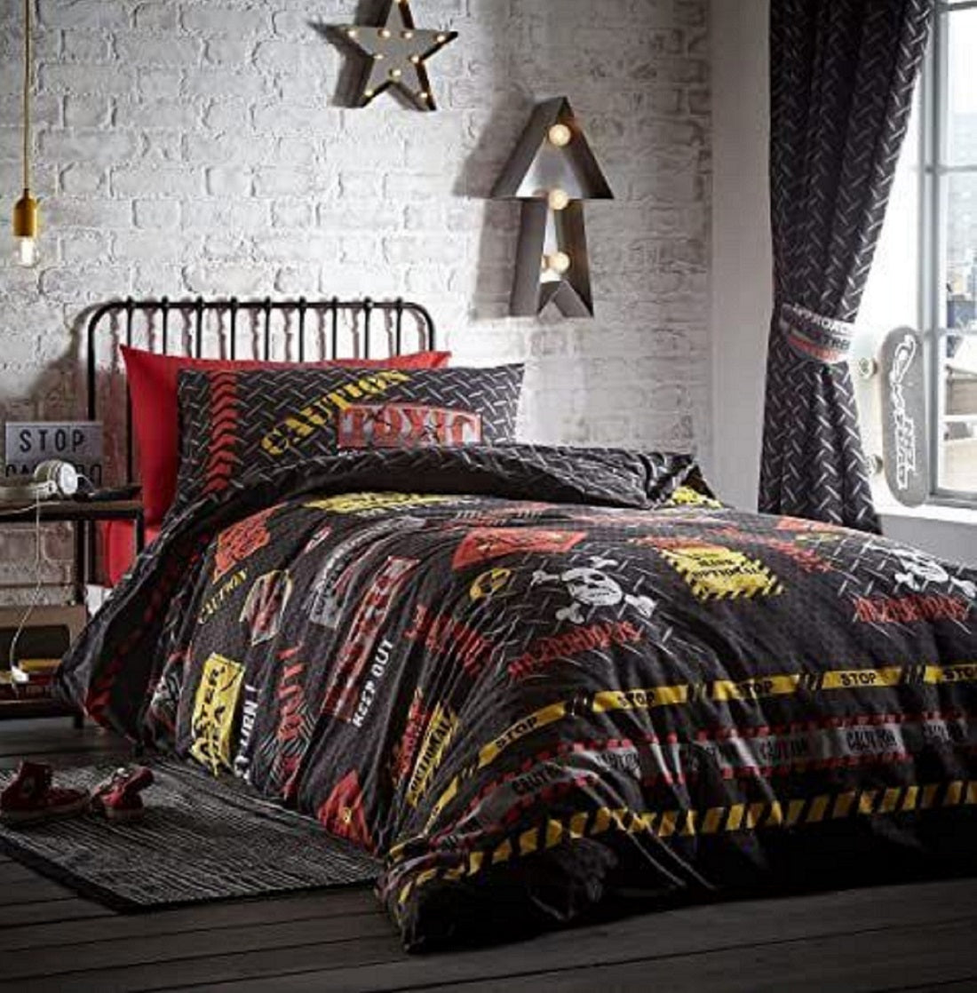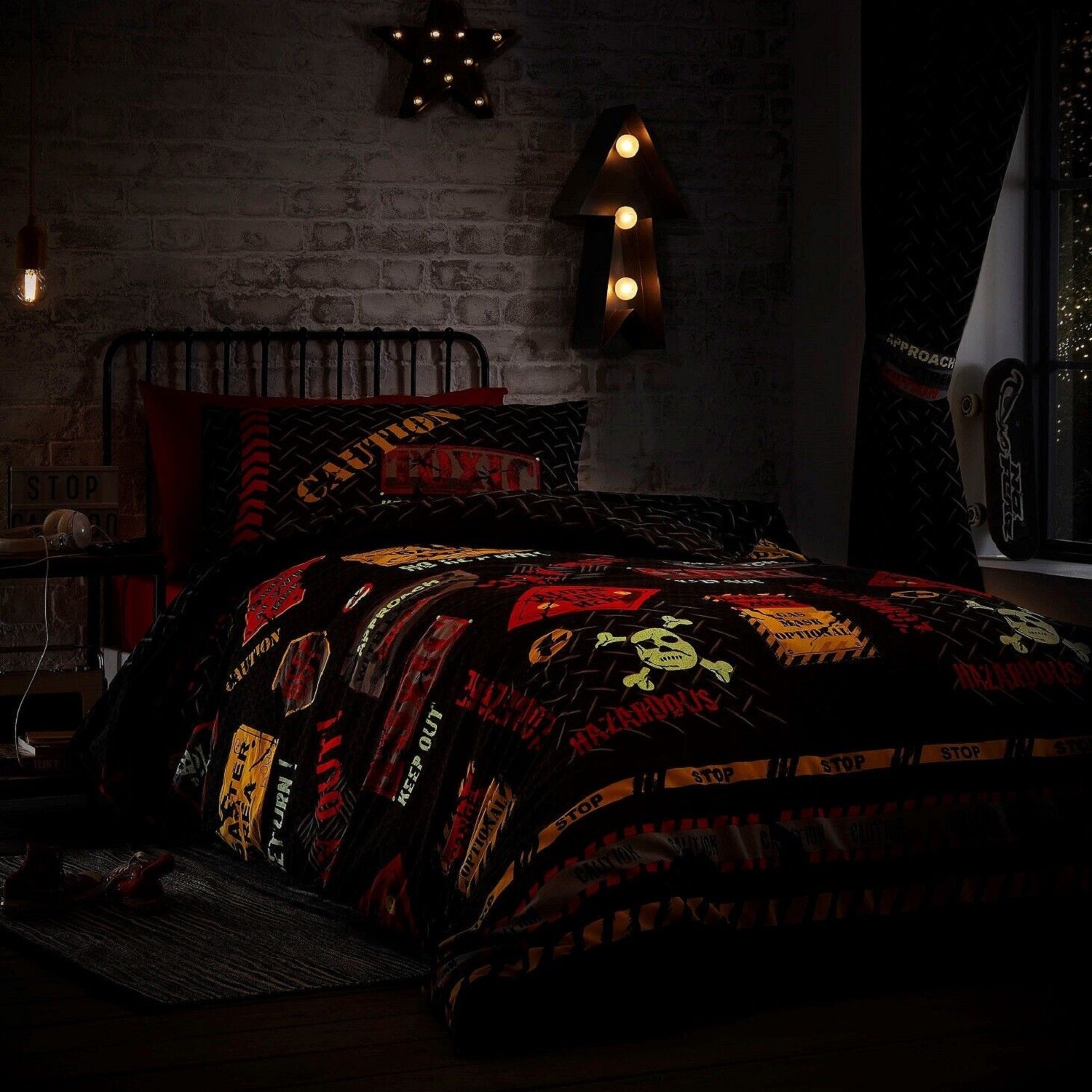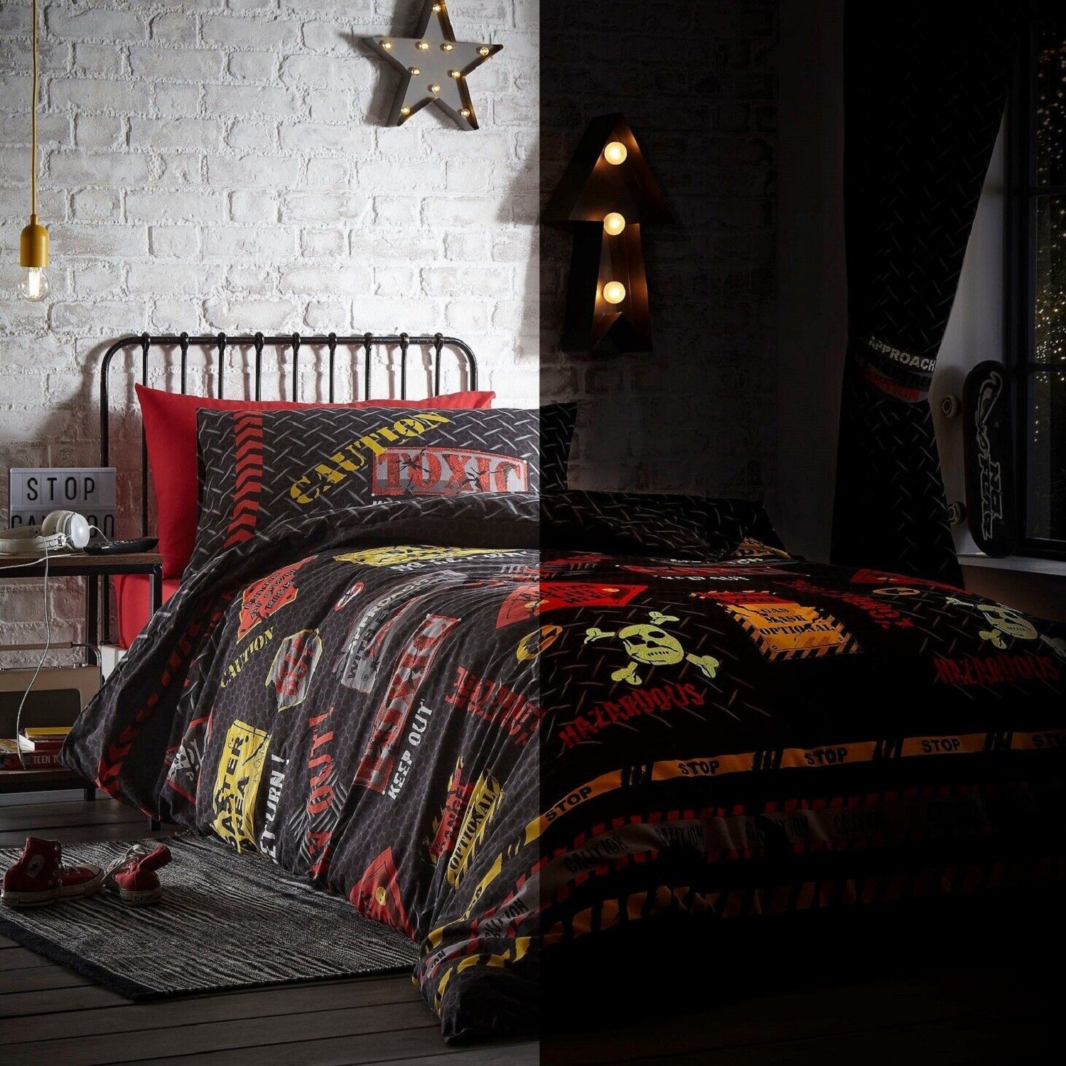 These Toxic duvet cover and pillow case sets by Portfolio are from the Kids Club range and have a Danger and Caution logo Glow In The Dark design on one side and metallic grate pattern on the reverse.