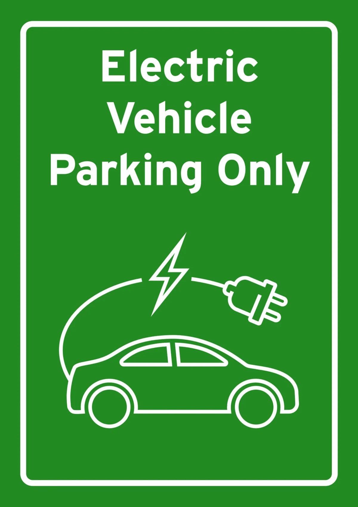 Sign reads 'Electric Vehicle Parking Only' with a white electric car graphic on a green background.
