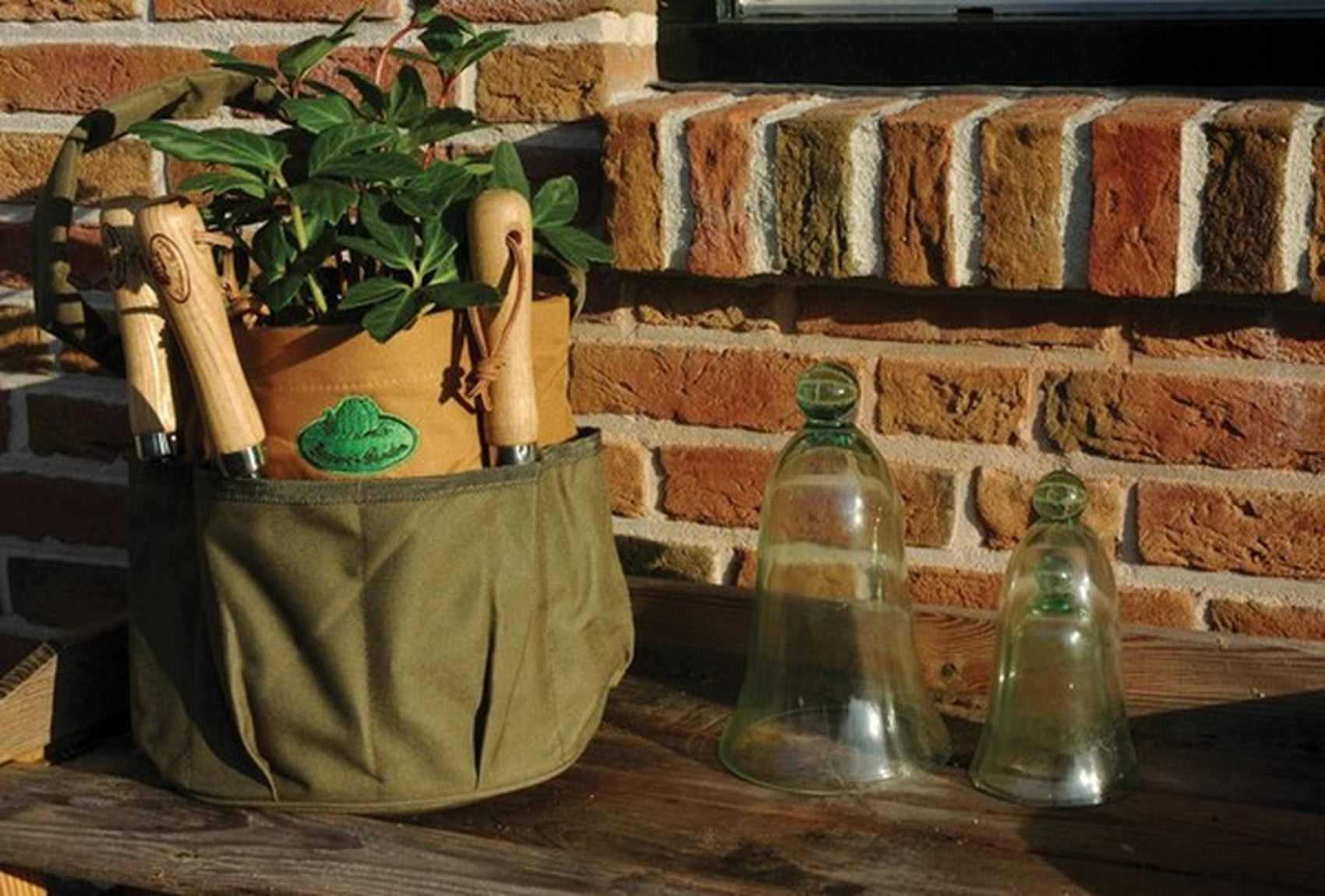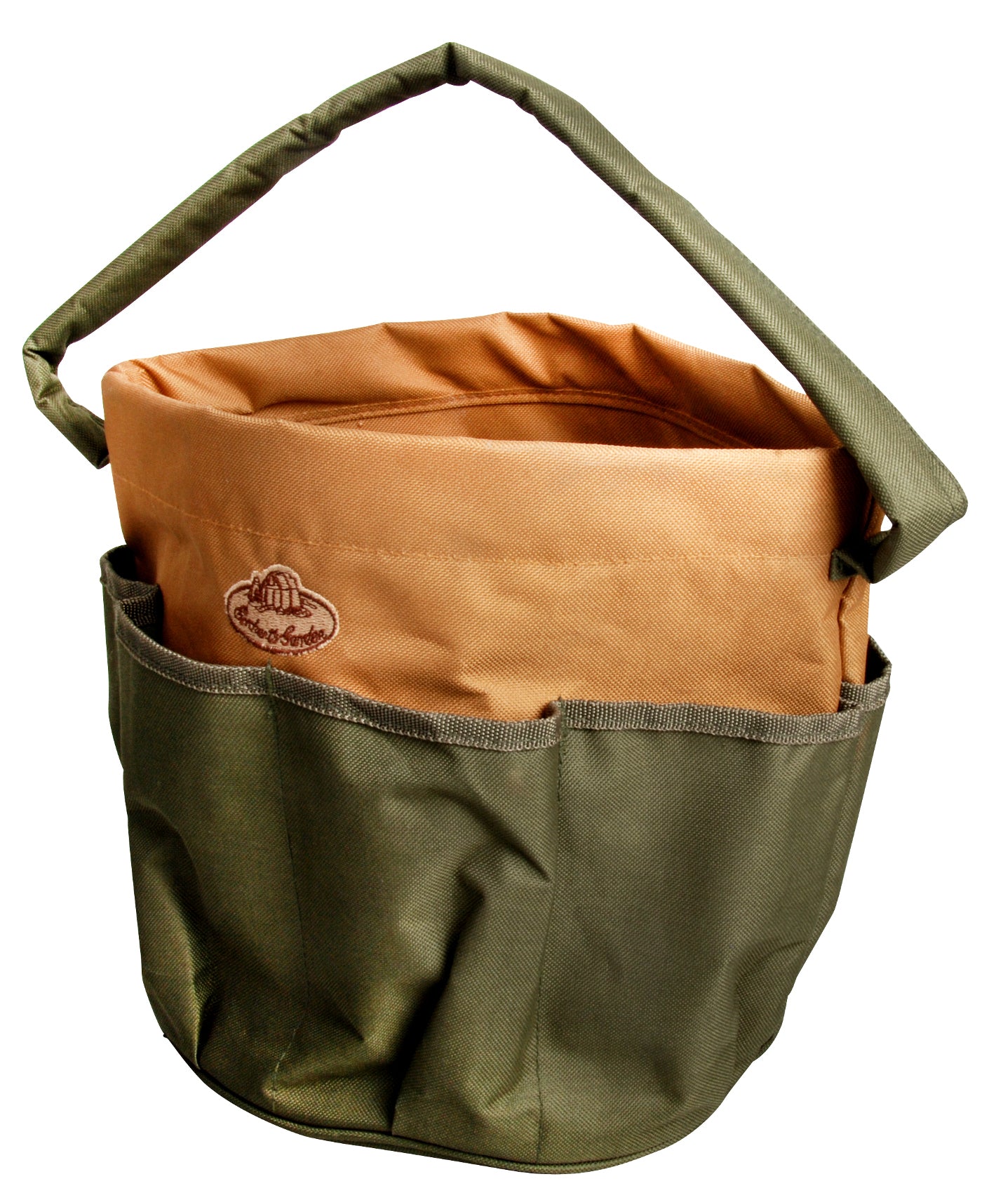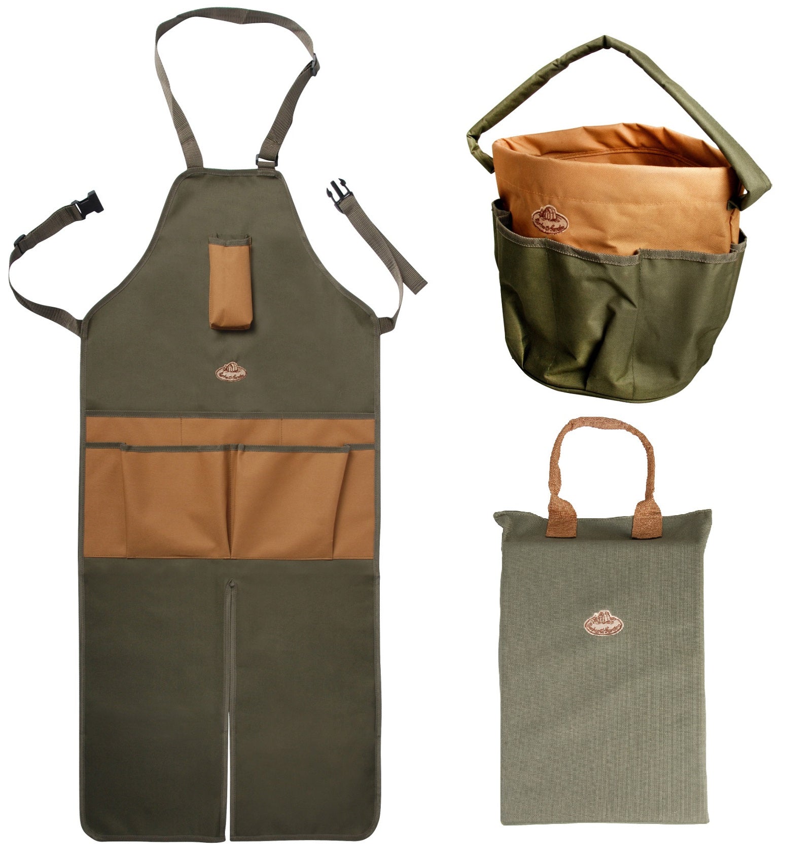 - Details: This khaki and brown gardening set is perfect for beginner and experienced gardeners alike! It includes a kneeling pad, round 'bucket' style toolbag and a split leg apron.