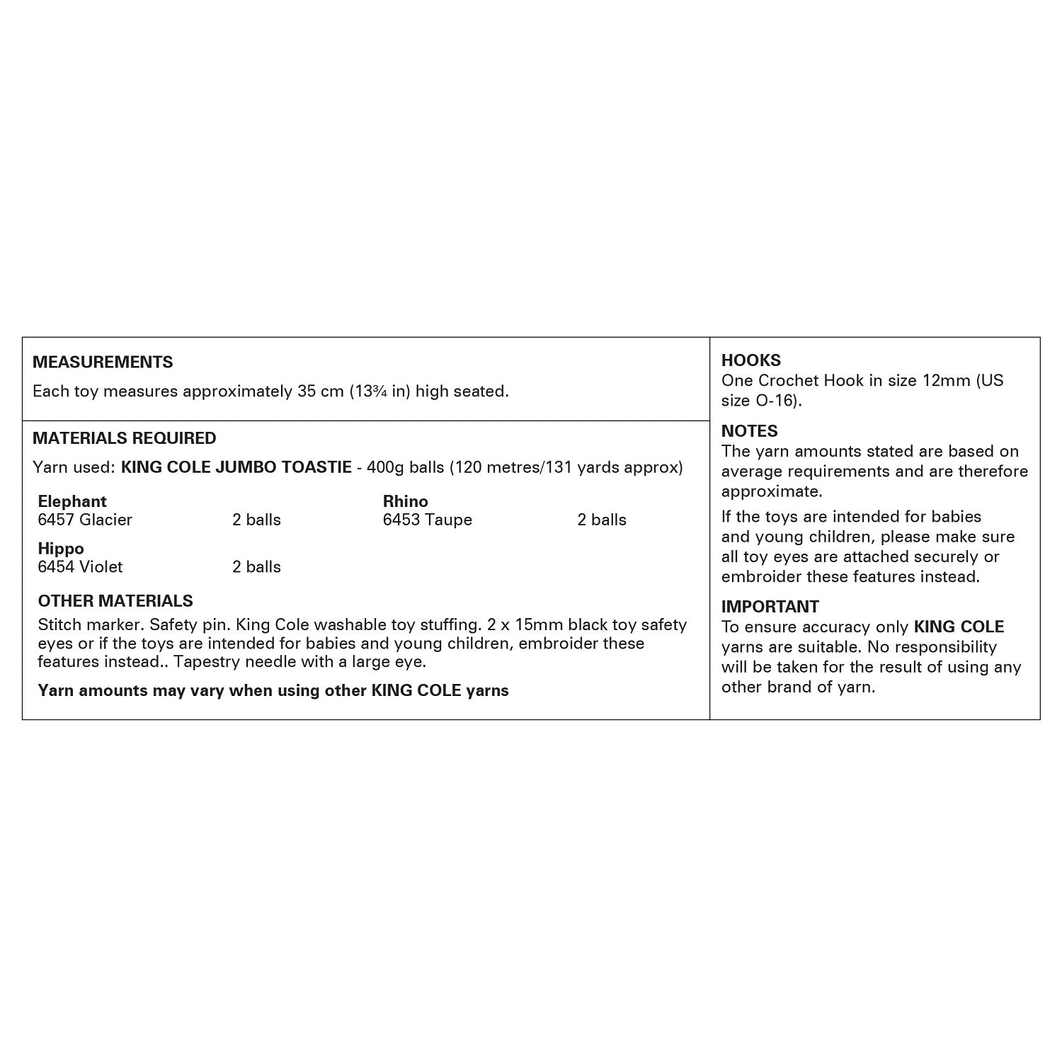 Details: This is a King Cole Crochet pattern that instructs you on how to create Elephant, Hippo and Rhino Stuffed Toys, using King Cole Jumbo Toastie yarns.