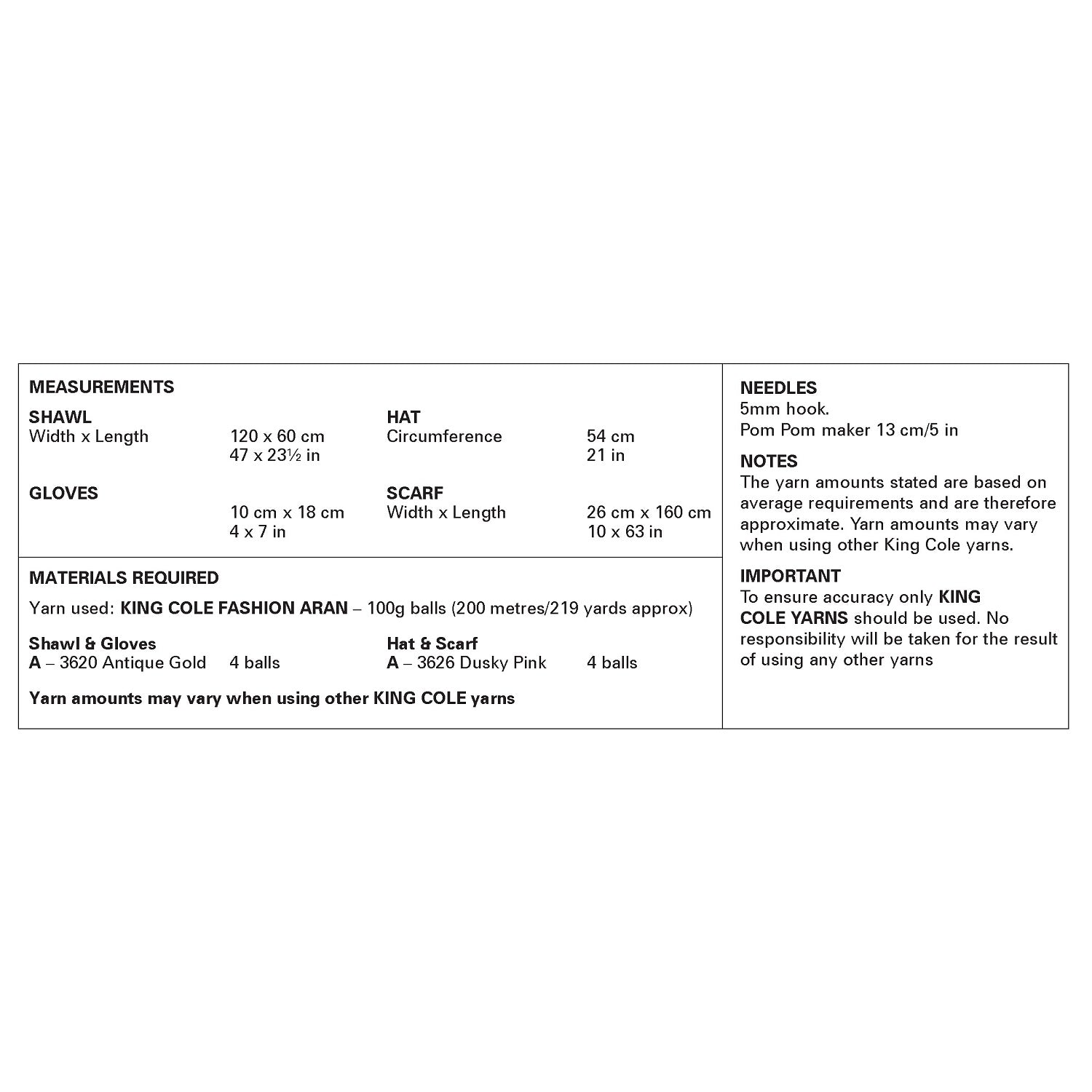 Details: This is a King Cole crochet pattern that instructs you on how to make woman’s winter fashion accessories, using Fashion Aran yarn.