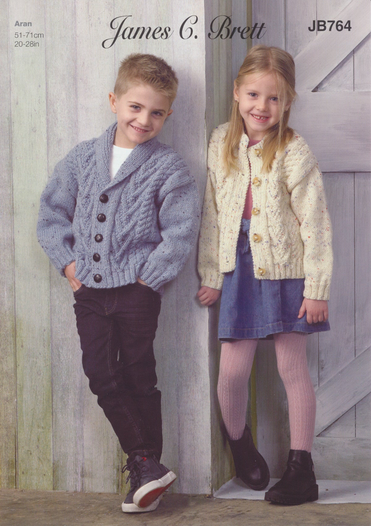 • Details: This James Brett aran knitting pattern instructs you how to knit a child's cable knit cardigan and jacket, using Rustic Aran yarn.