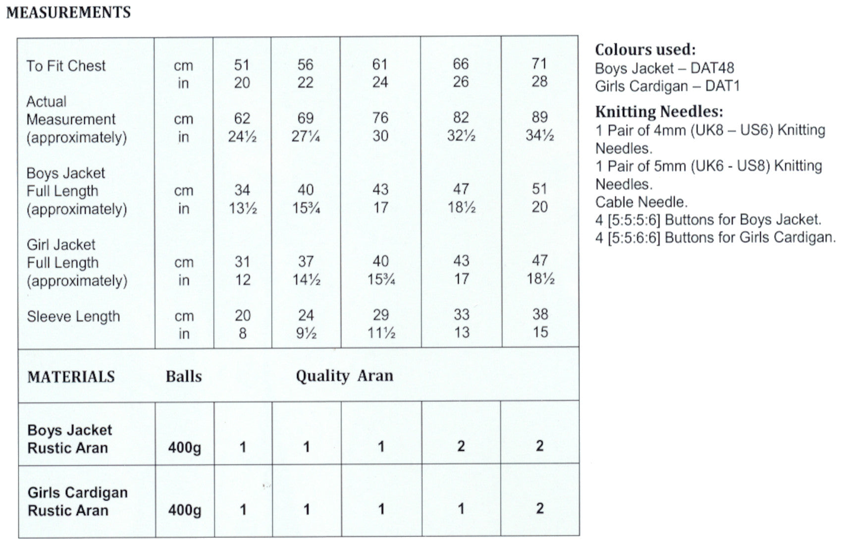 This aran knitting pattern leaflet JB764 by James Brett will instruct you on how to knit a child's cable knit jacket and cardigan.