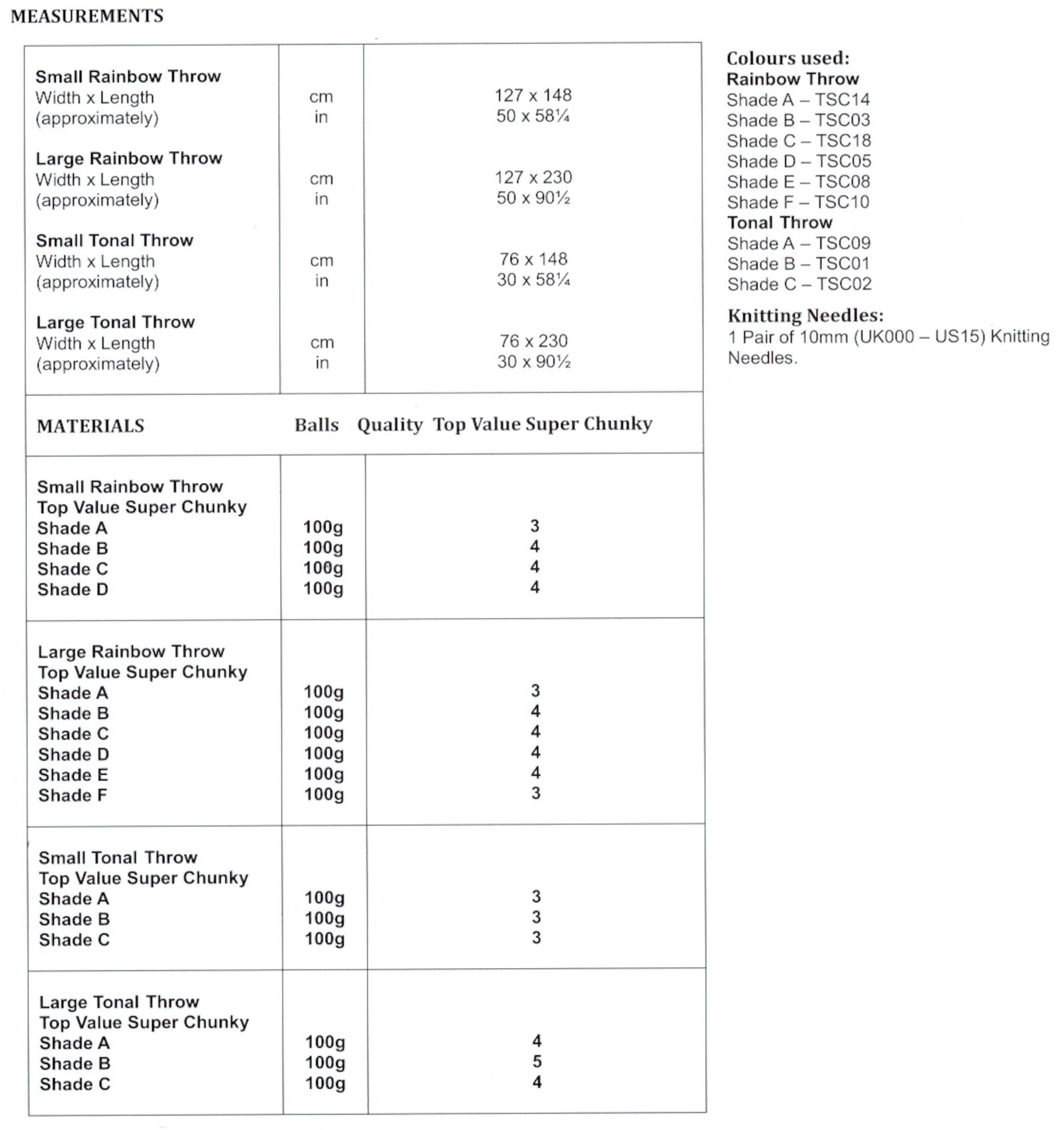 • Details: This James Brett super chunky knitting pattern instructs you how to knit a small and large rainbow or tonal throw, using Top Value Super Chunky yarn.