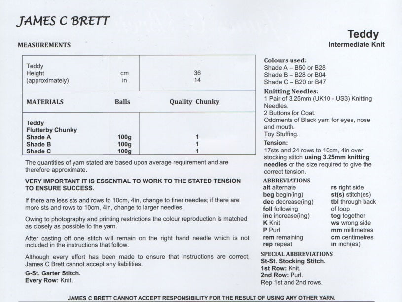 This knitting pattern leaflet JB809 by James Brett will instruct you on how to create a stuffed Teddy.