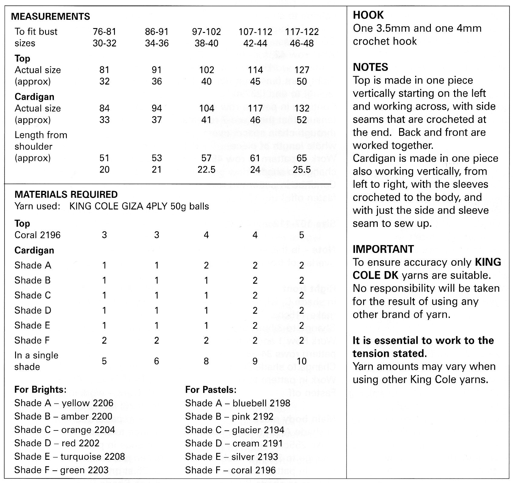 - Details: This is a King Cole ladies crochet pattern that instructs you how to create a short sleeved cardigan and a cropped top, using Giza 4ply yarn.