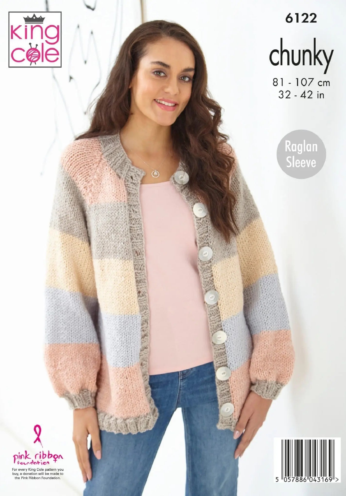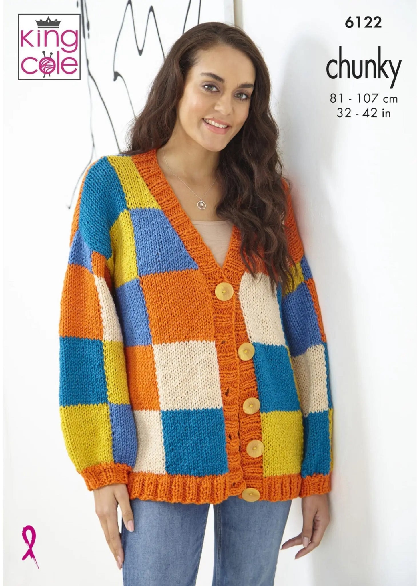 This chunky knitting pattern leaflet 6122 by King Cole will instruct you on how to create a ladies long sleeve cardigan with stripes or squares design.