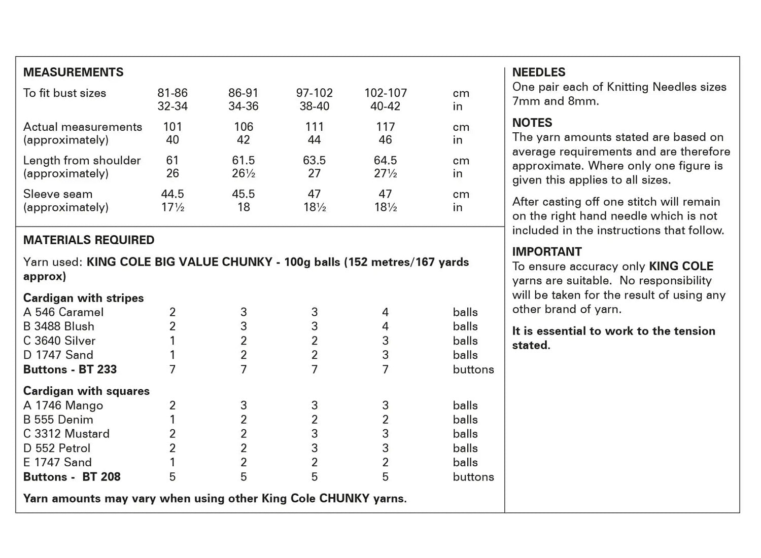 This King Cole knitting pattern is suitable for use with most chunky yarns, however tensions may vary and we recommend you knit a tension square before knitting the whole garment.