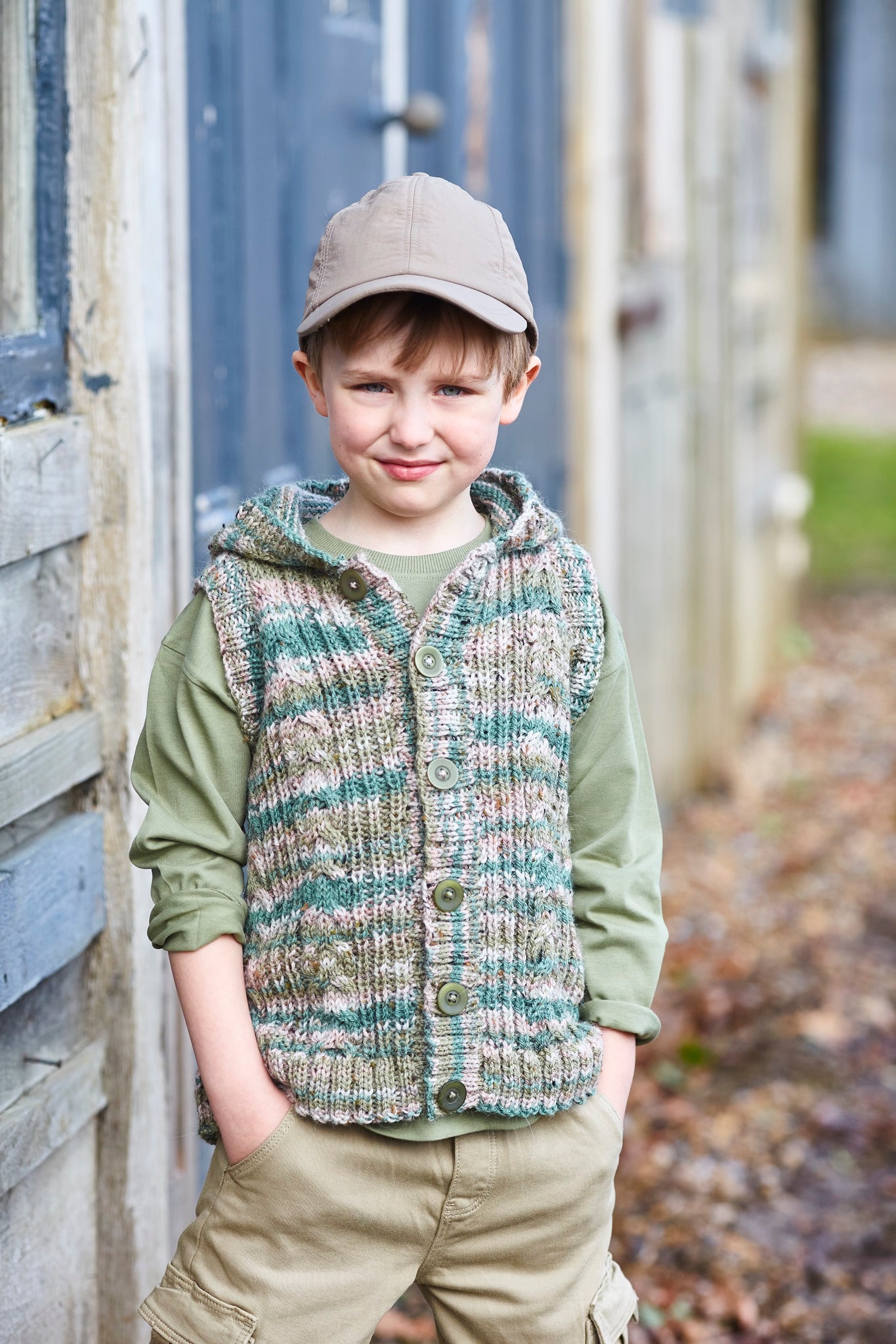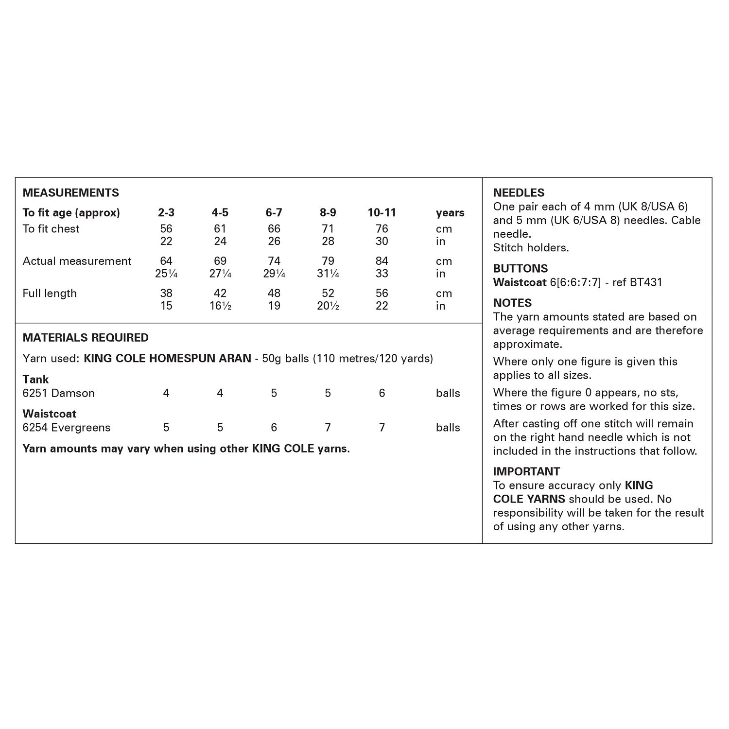 Details: This is a King Cole Boy's knitting pattern that instructs you how to knit a Tank & Waistcoat, using Homespun Aran yarn.