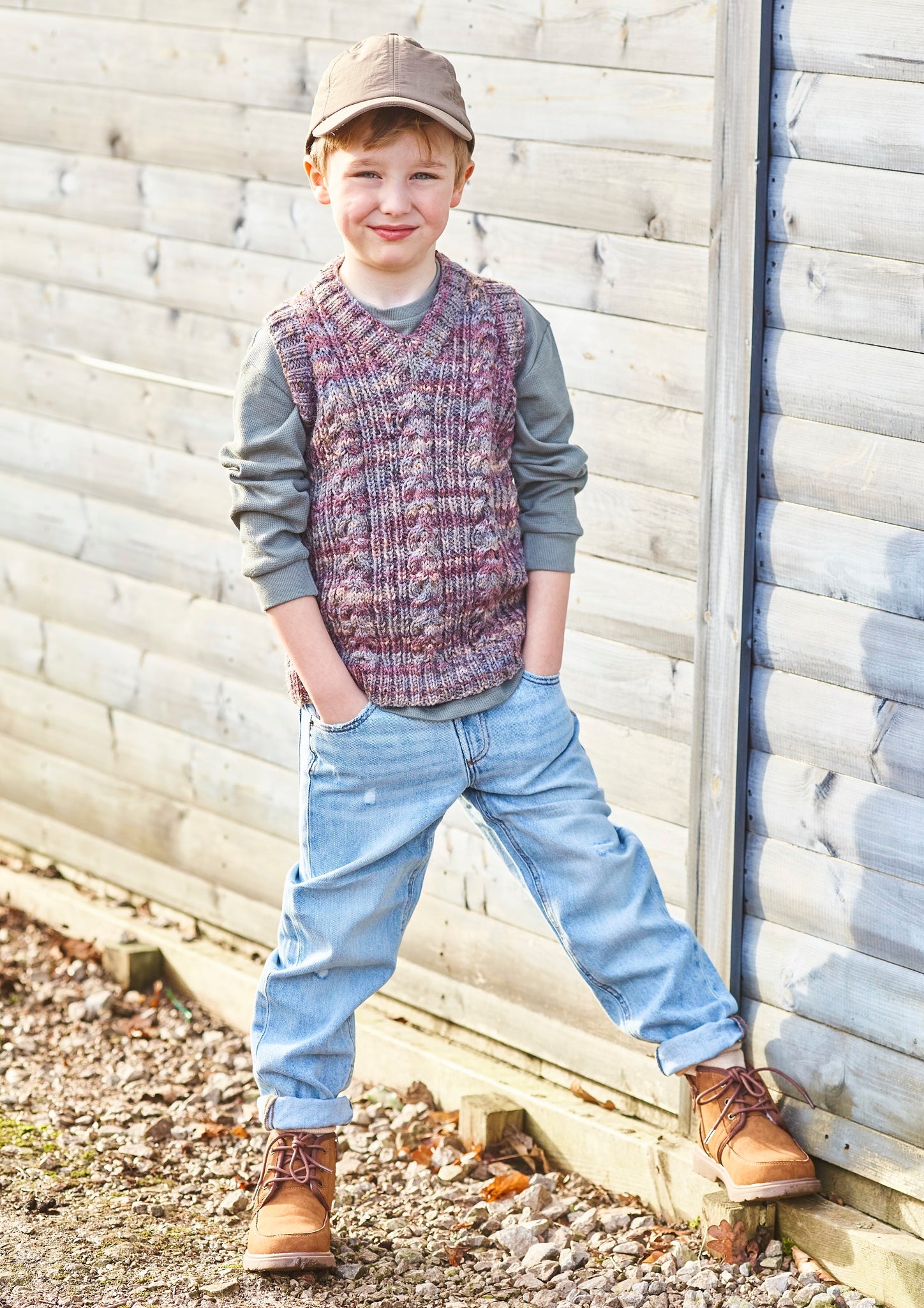 This Aran knitting pattern leaflet 6306 by King Cole will instruct you on how to create a Boys Tank & Waistcoat.