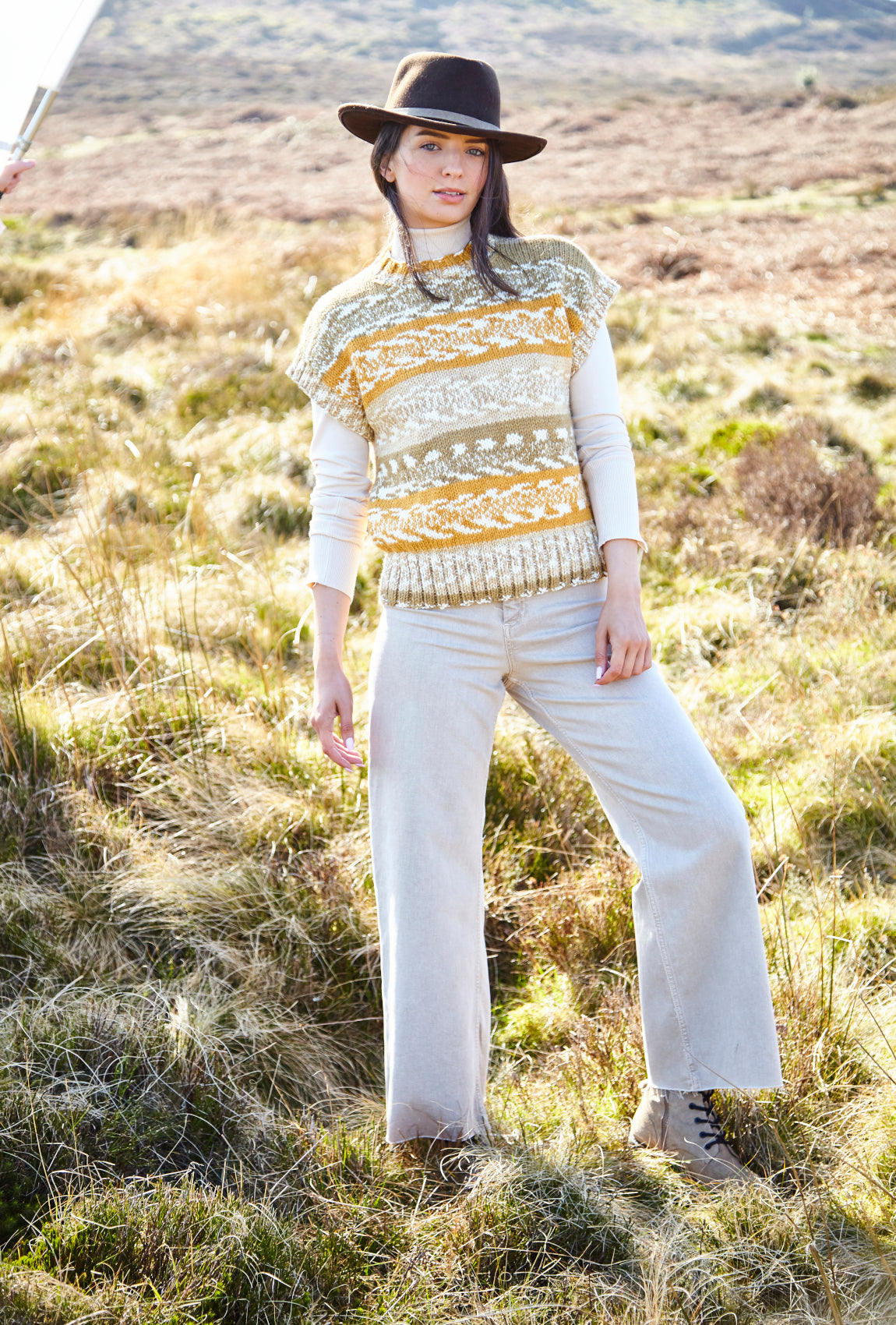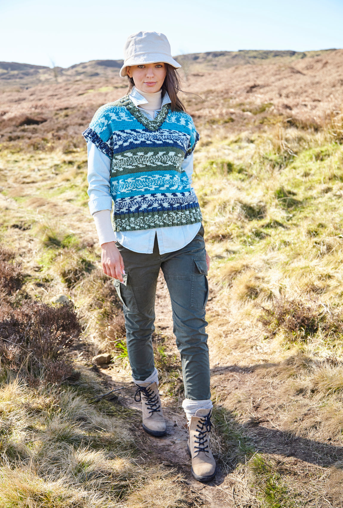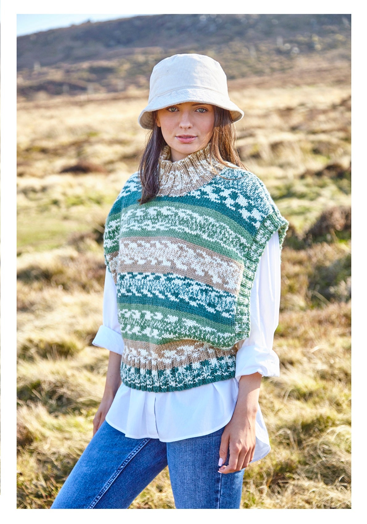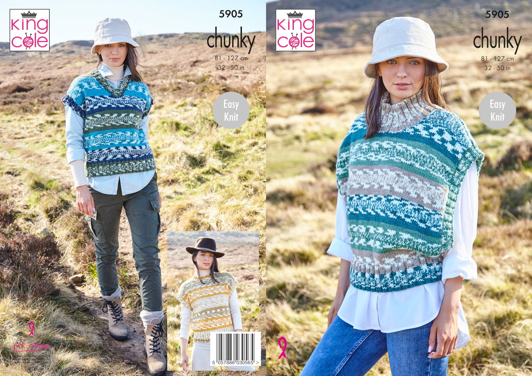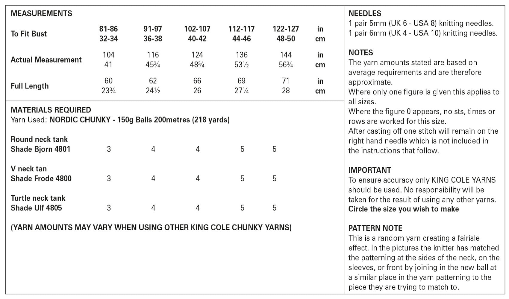 • Details: This is a King Cole knitting pattern that instructs you on how to knit a ladys round, v neck or turtle neck tank top, using Nordic Chunky yarn.