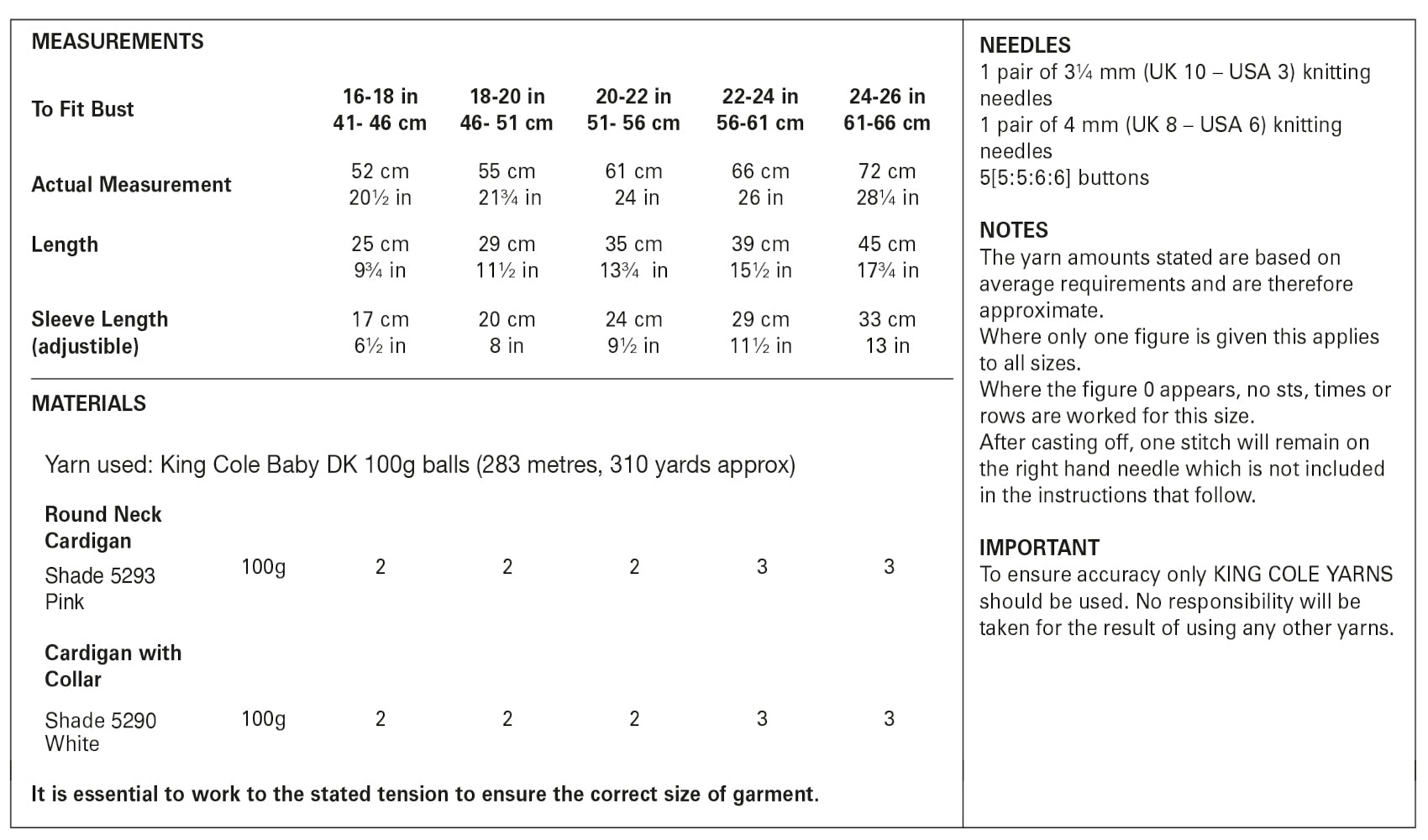 - Details: This is a King Cole baby double knit knitting pattern that instructs you on how to knit a cardigan with a round neck or collar, using King Cole Baby DK yarn. Proceeds from this sale go toward the DEC Turkey-Syria Earthquake Appeal.