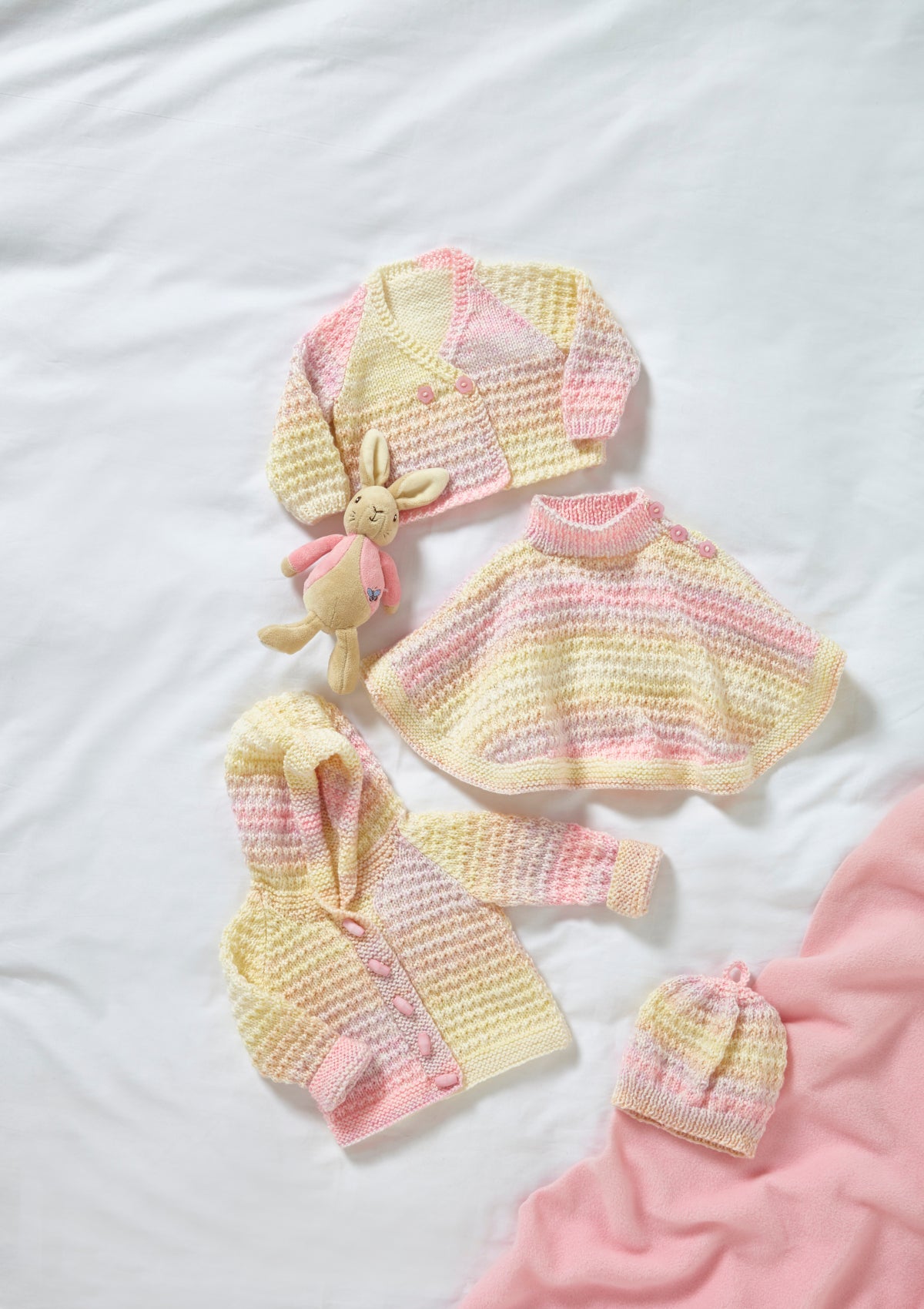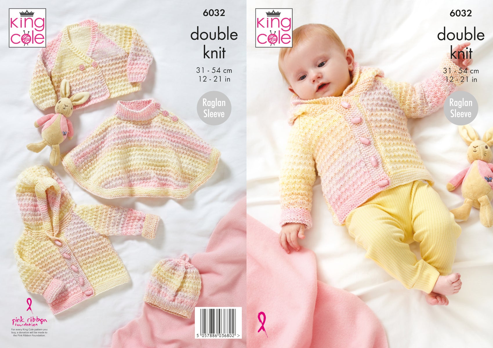 This baby double knit knitting pattern leaflet 6032 by King Cole will instruct you on how to create a raglan sleeve jacket, cape, cardigan, and hat.