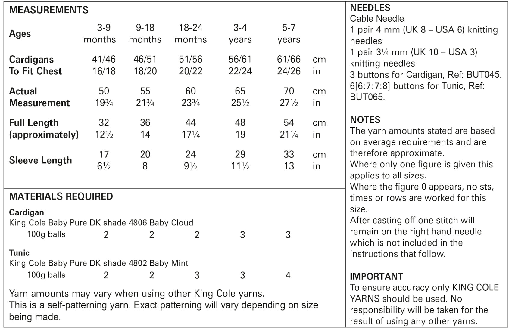 • Details: This is a King Cole baby double knit knitting pattern that instructs you on how to knit a cardigan and button back tunic, using Baby Pure DK yarn.