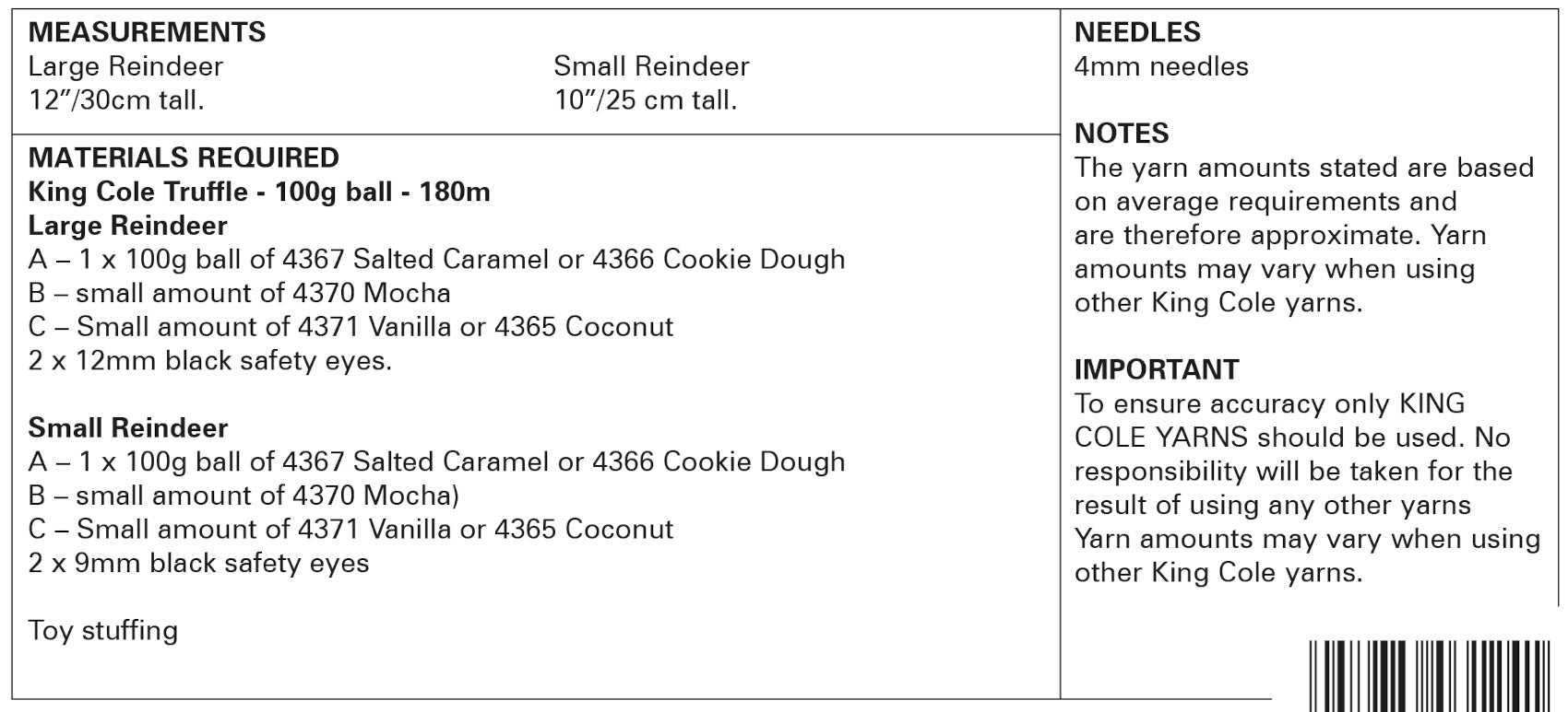 This double knit knitting pattern leaflet 9167 by King Cole will instruct you on how to create cute reindeer toys in two sizes.