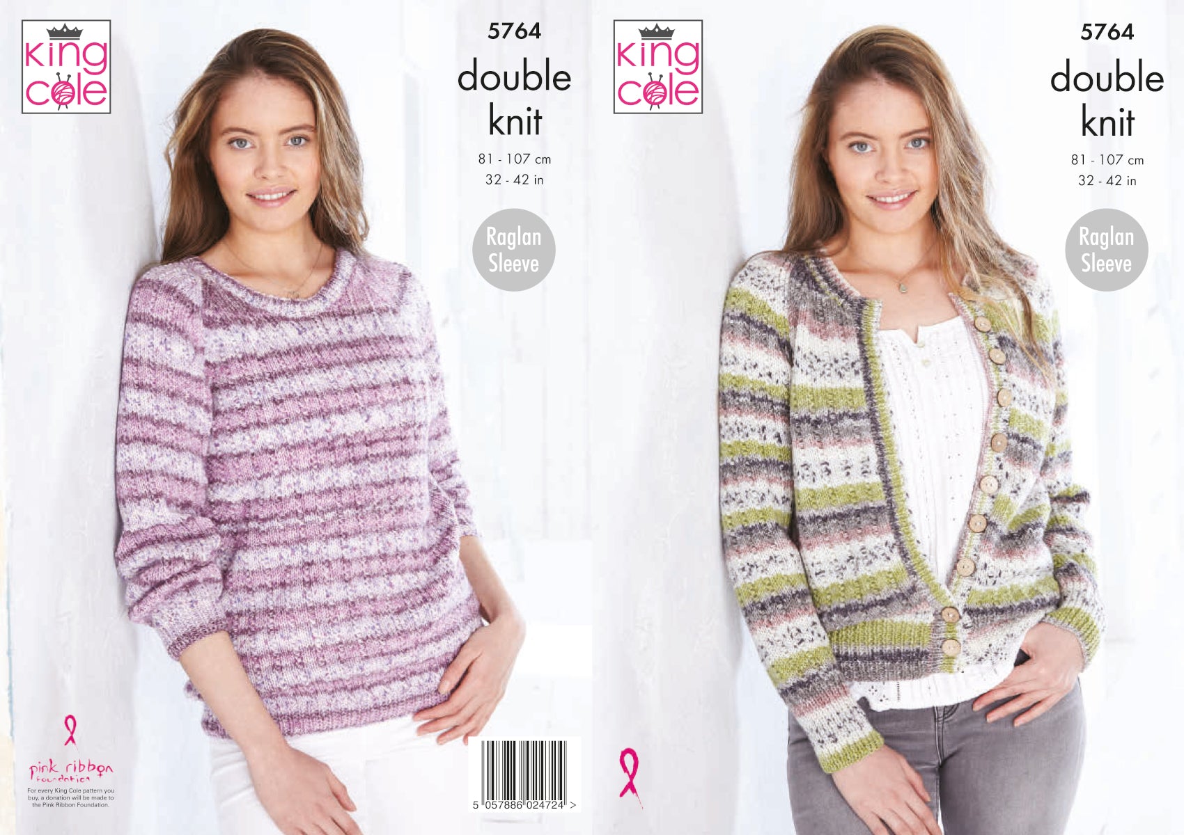 This double knit knitting pattern leaflet 5764 by King Cole will instruct you on how to create a lady's raglan sleeve sweater and cardigan with all over lace detail.
