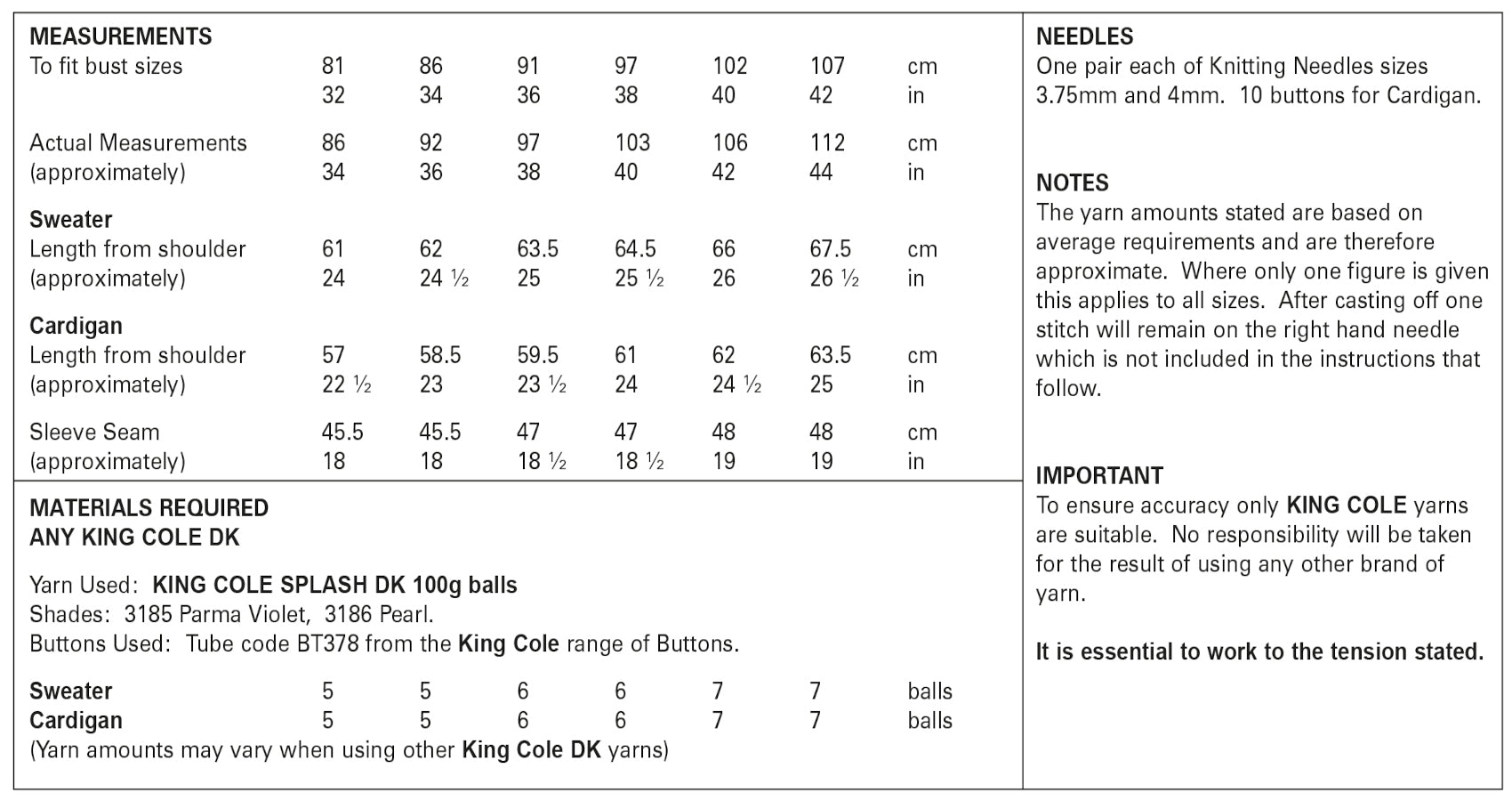 This King Cole knitting pattern is suitable for use with most double knit yarns, however tensions may vary and we recommend you knit a tension square before knitting the whole garment.
