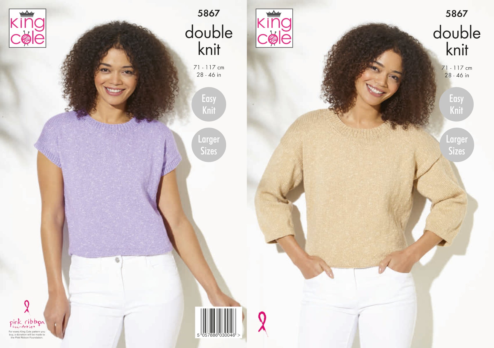 This easy knit double knit knitting pattern leaflet 5867 by King Cole will instruct you on how to create a lady's sweater and top.