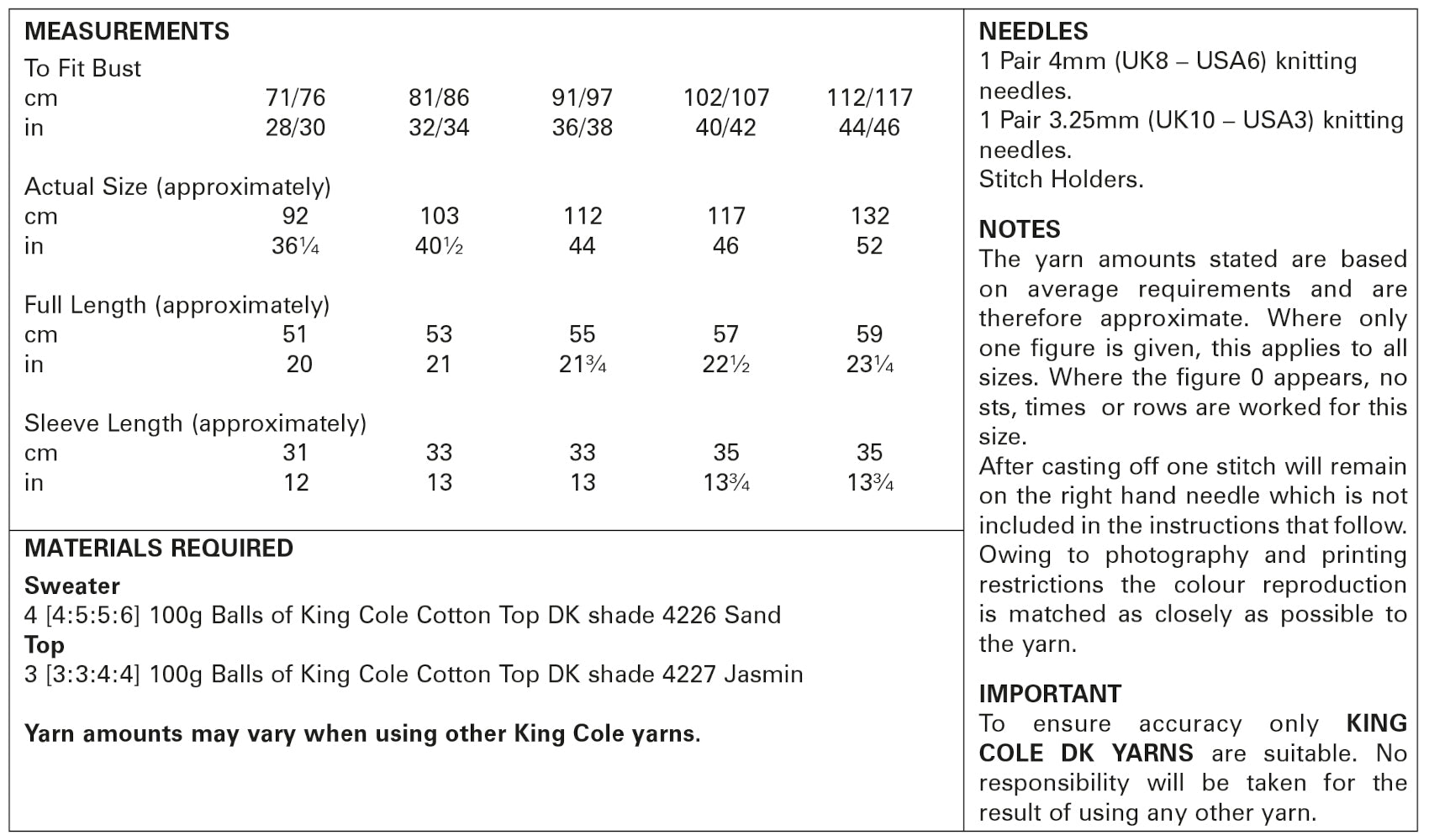 - Details: This is a King Cole knitting pattern that instructs you on how to knit a lady's sweater and top, using Cotton Top DK yarn.