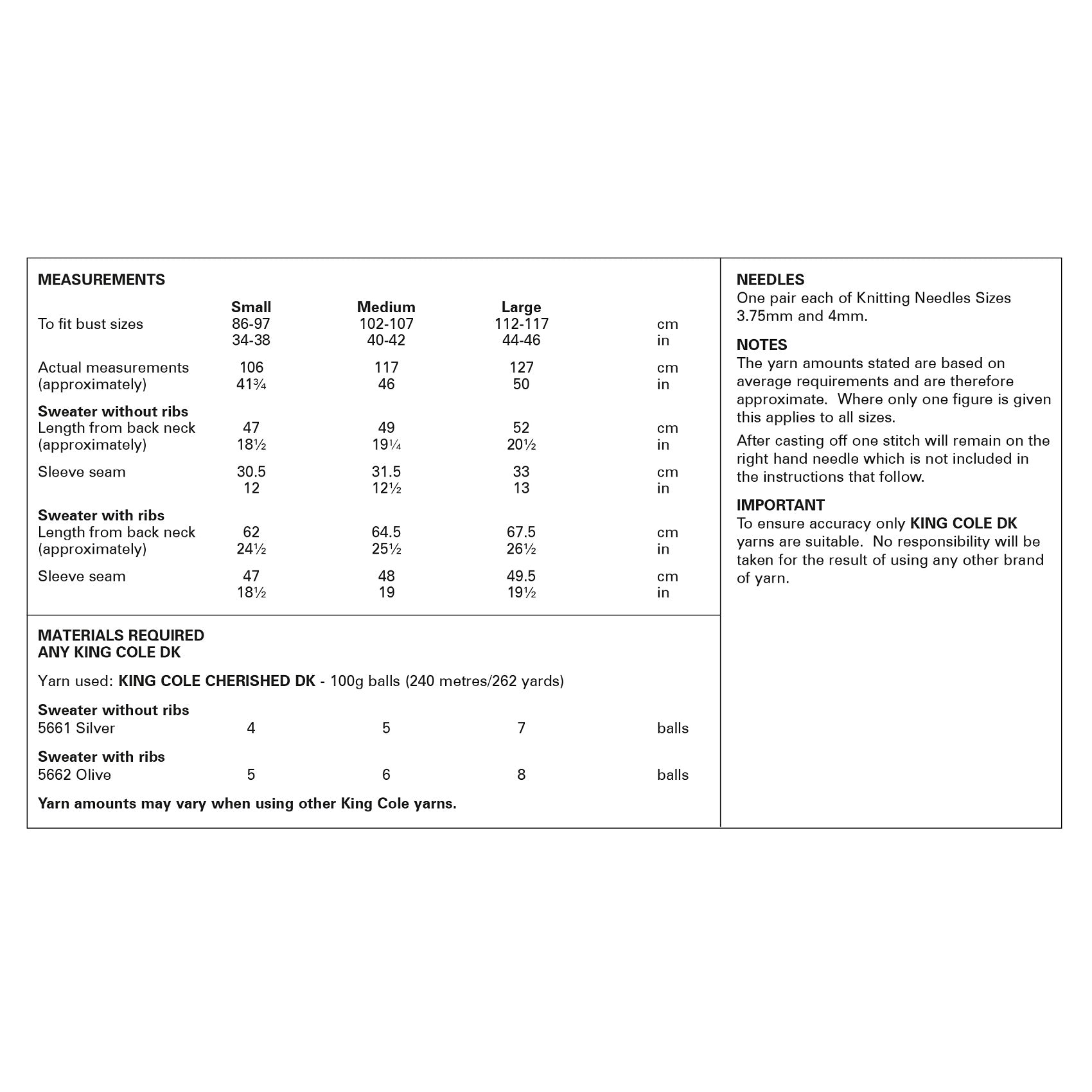 • Details: This is a King Cole double knit pattern that instructs you how to knit ladies sweater with or without ribbed details, using Cherished DK yarn.