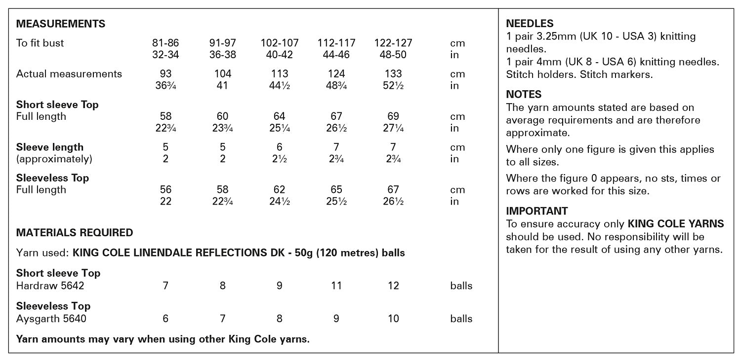 This double knitting pattern leaflet 6128 by King Cole will instruct you on how to create a ladies short sleeve and sleeveless vest top.