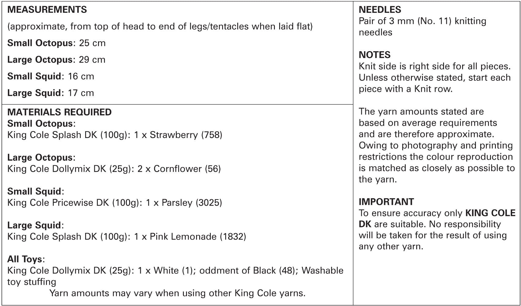 • Details: This is a King Cole double knitting pattern that instructs you how to knit cute octopus and squid toys in two sizes, using King Cole DK yarns.
