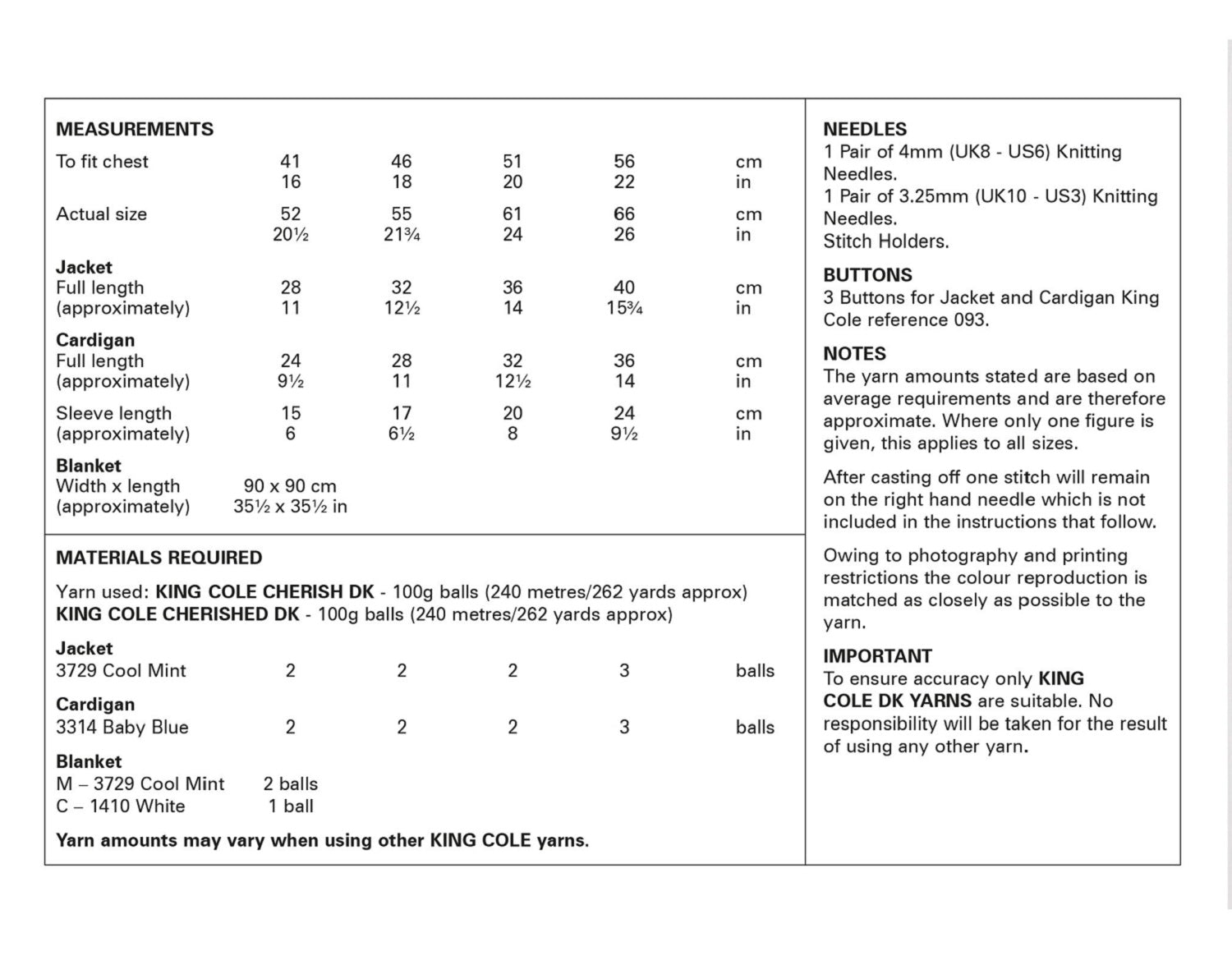 Details: This is a King Cole knitting pattern that instructs you how to knit a Babies Jacket, Cardigan & Blanket, using Cherish DK & Cherished DK yarn.