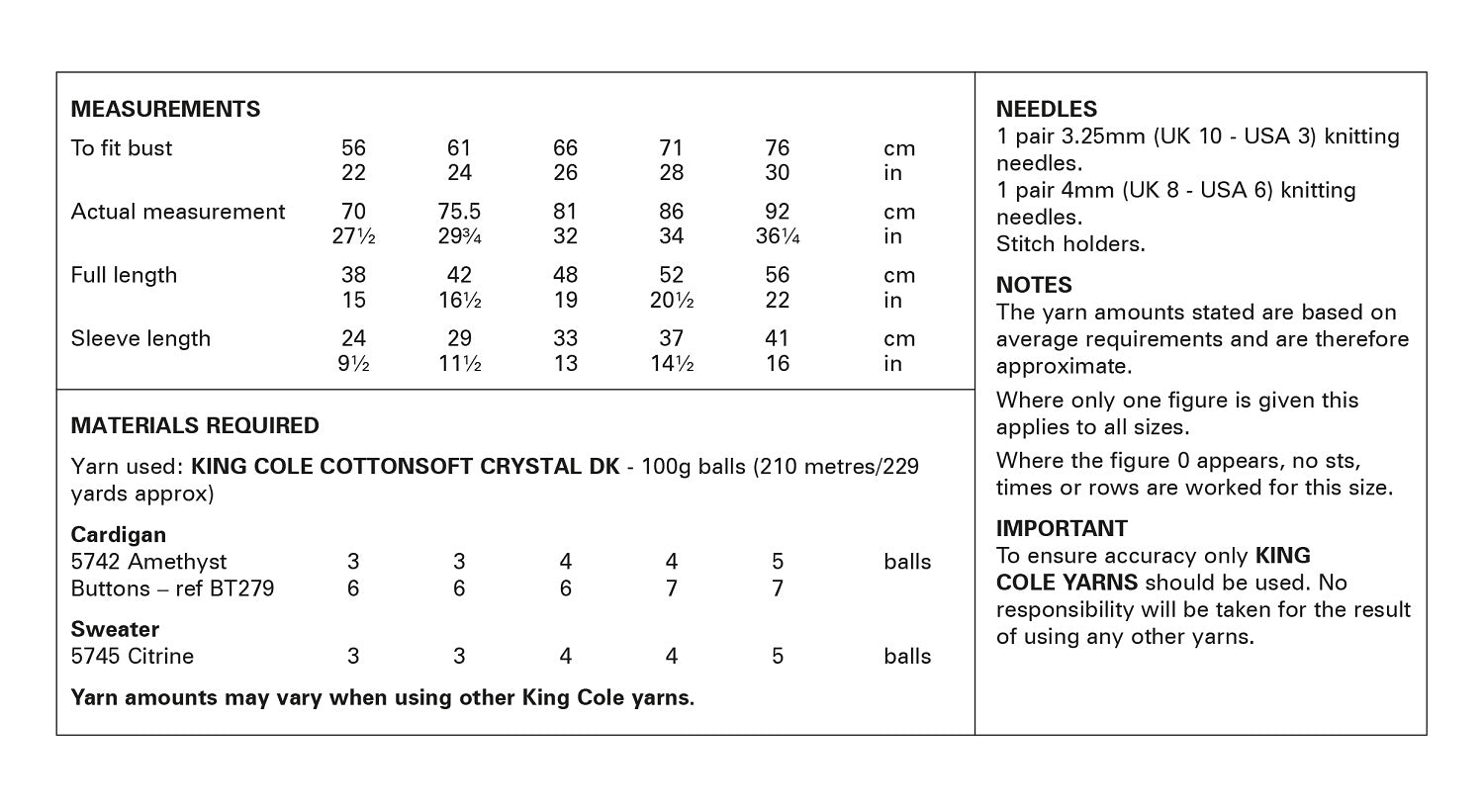 This King Cole knitting pattern is suitable for use with most double knit yarns, however tensions may vary and we recommend you knit a tension square before knitting the whole garment.