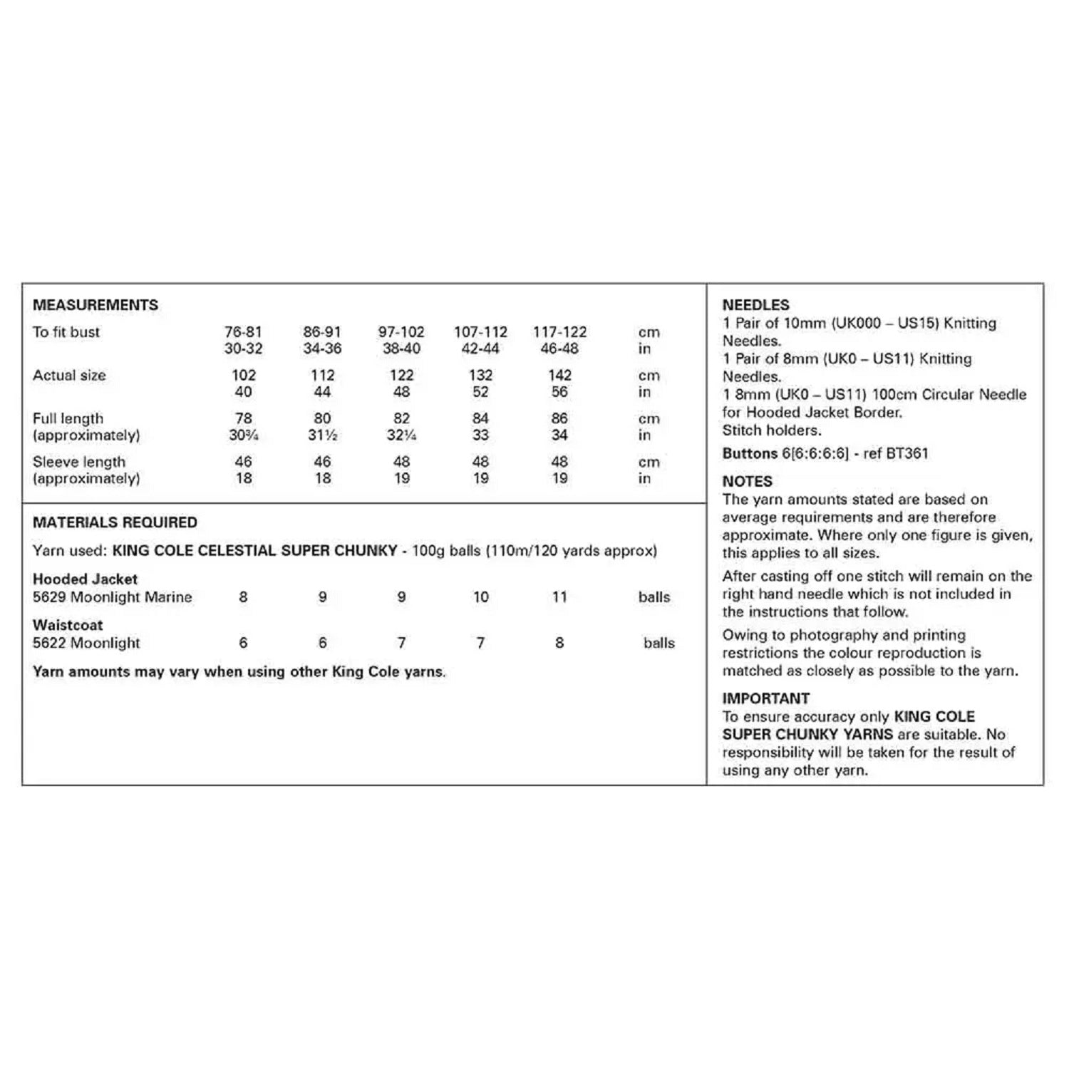 Details: This is a King Cole knitting pattern that instructs you on how to create a woman’s Super Chunky Hooded Jacket and Waistcoat , using Celestial super chunky yarn.