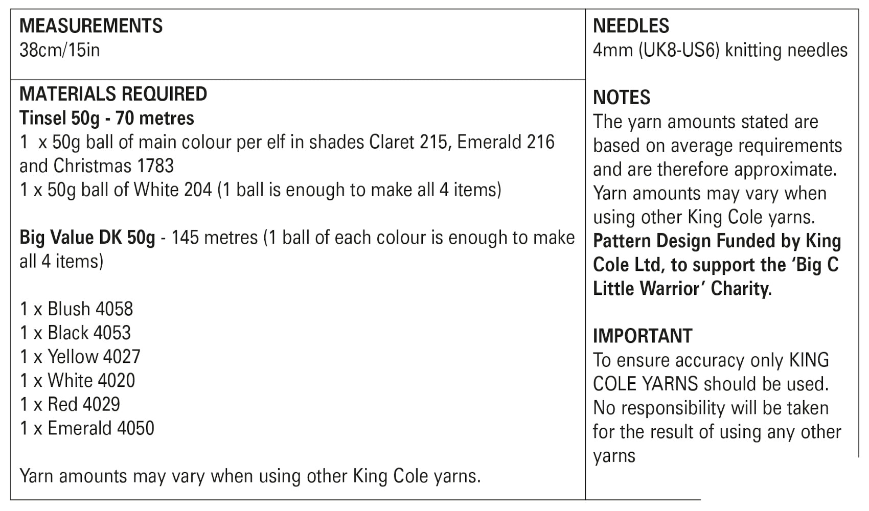 - Details: This is a King Cole knitting pattern that instructs you on how to knit a 'Playful Elf' to decorate the house during Christmas time, using Tinsel Chunky and Big Value DK yarn.