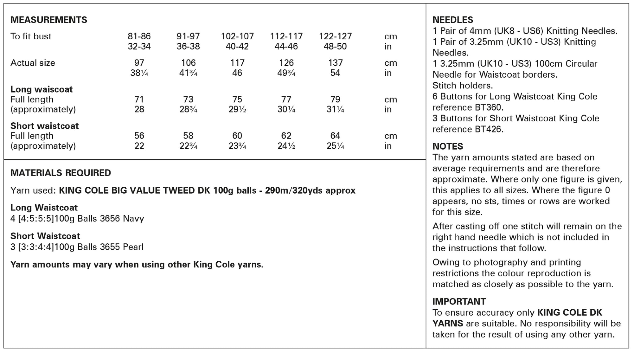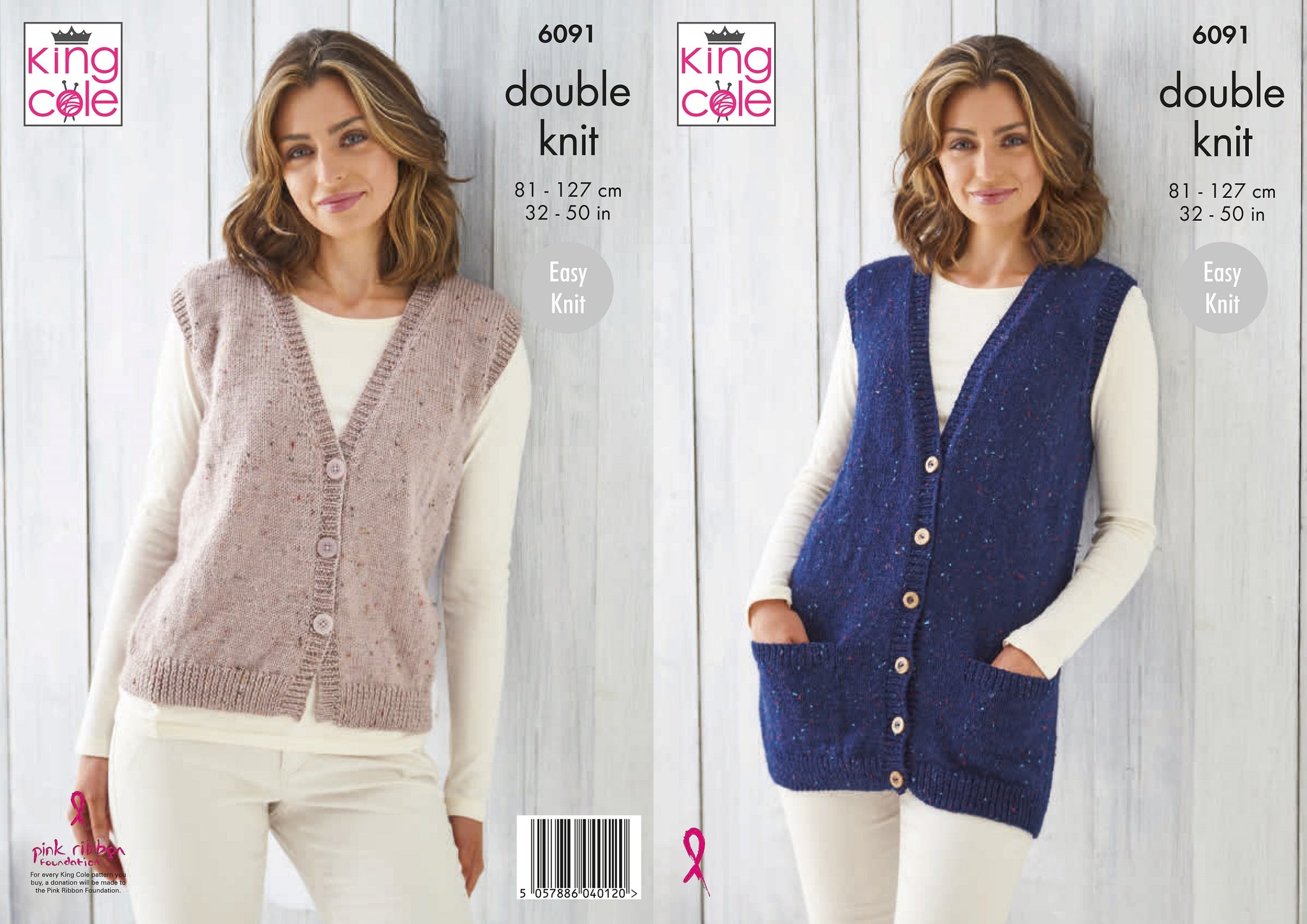 This double knit knitting pattern leaflet 6091 by King Cole will instruct you on how to create a ladies easy knit waistcoat using Tweed DK yarn.