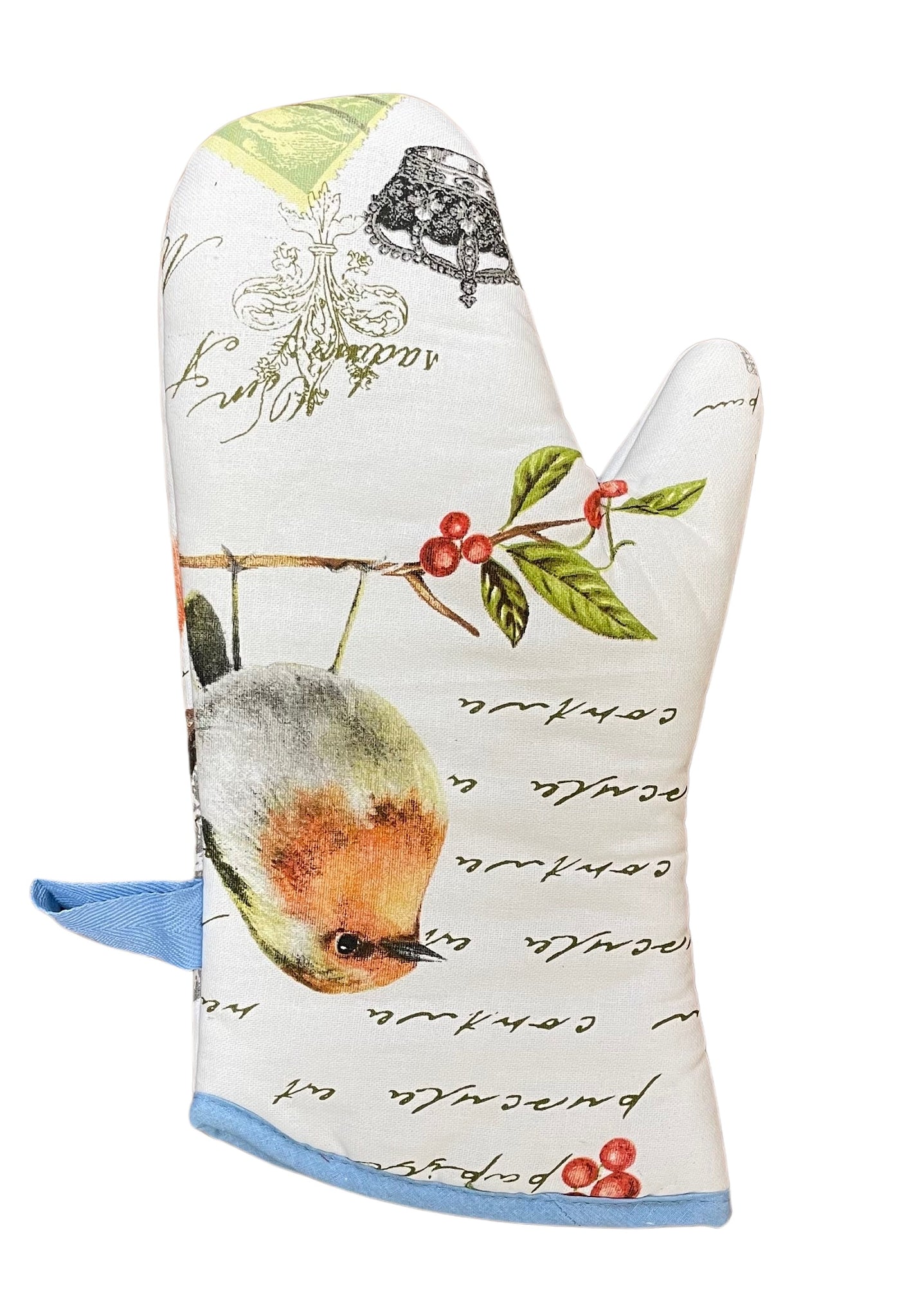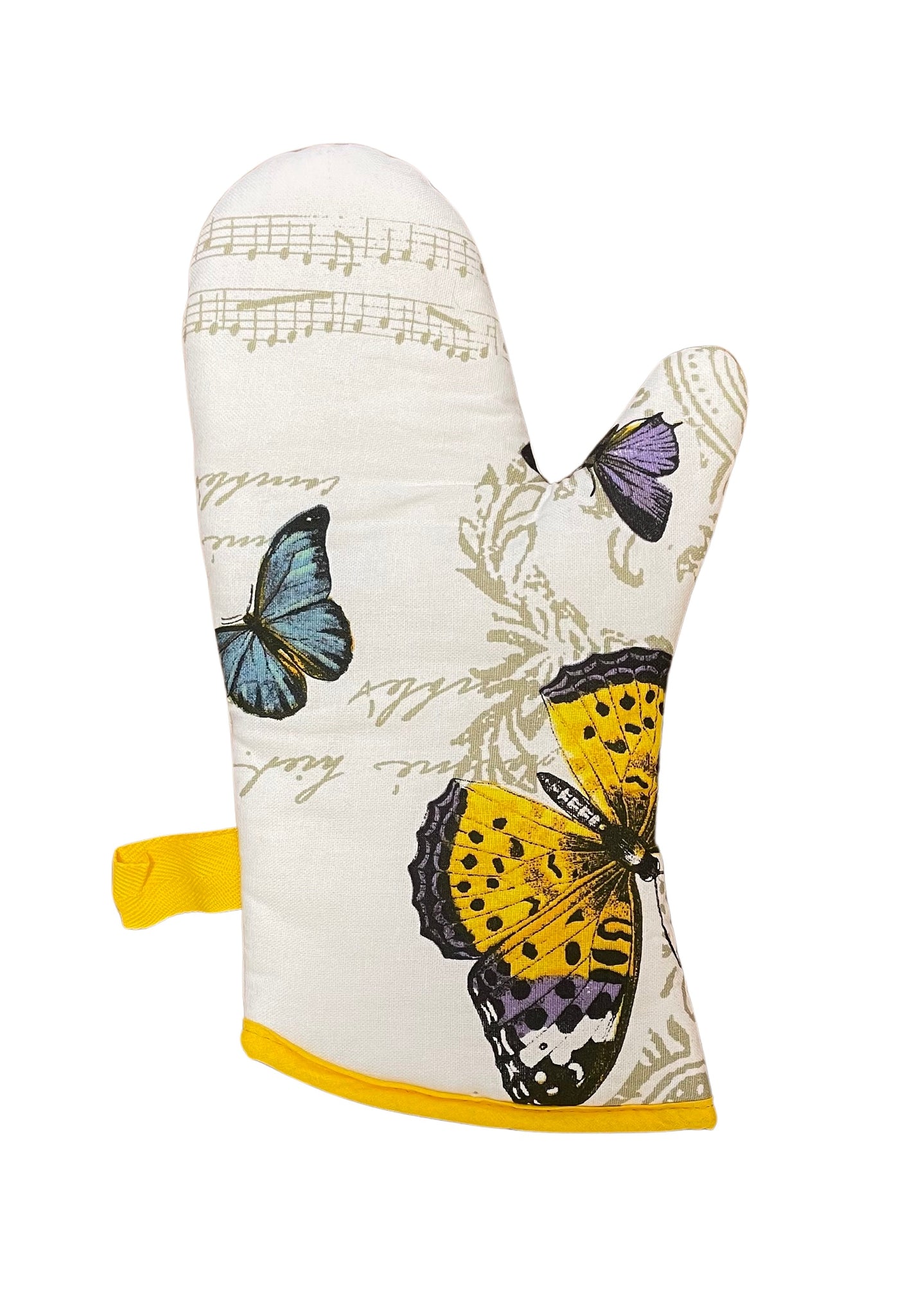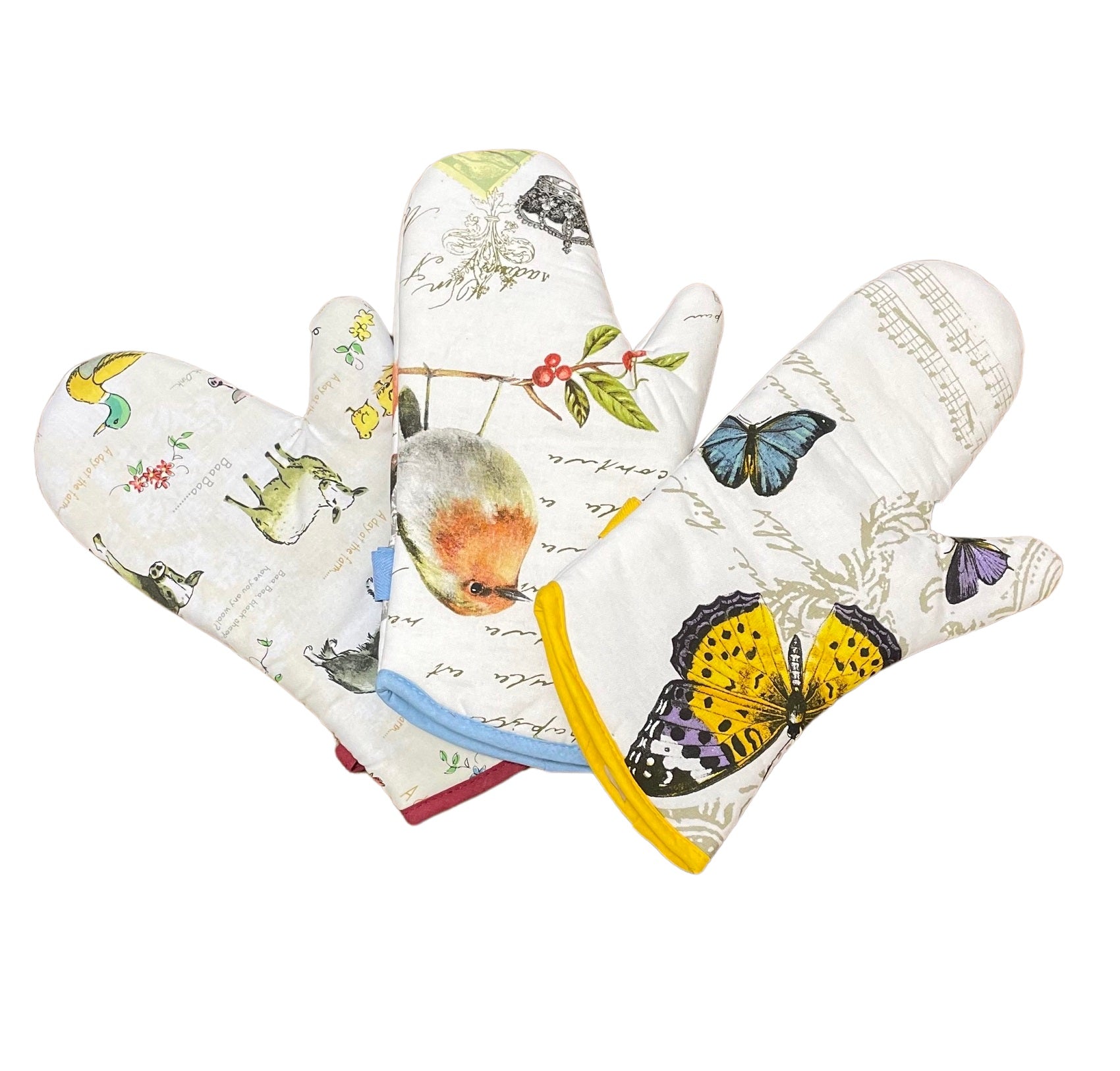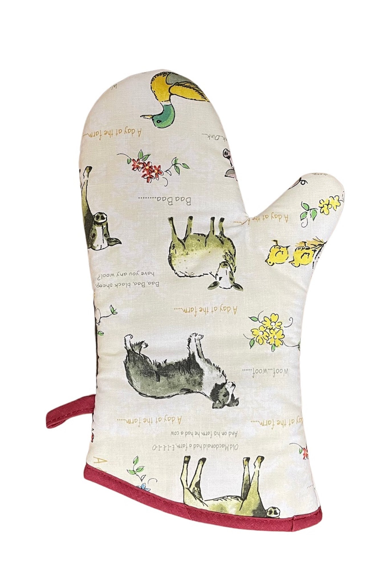 These quilted single oven gloves are available in 3 different designs; Farm animal, Songbird or Butterflies and comes with a convenient hanging loop.