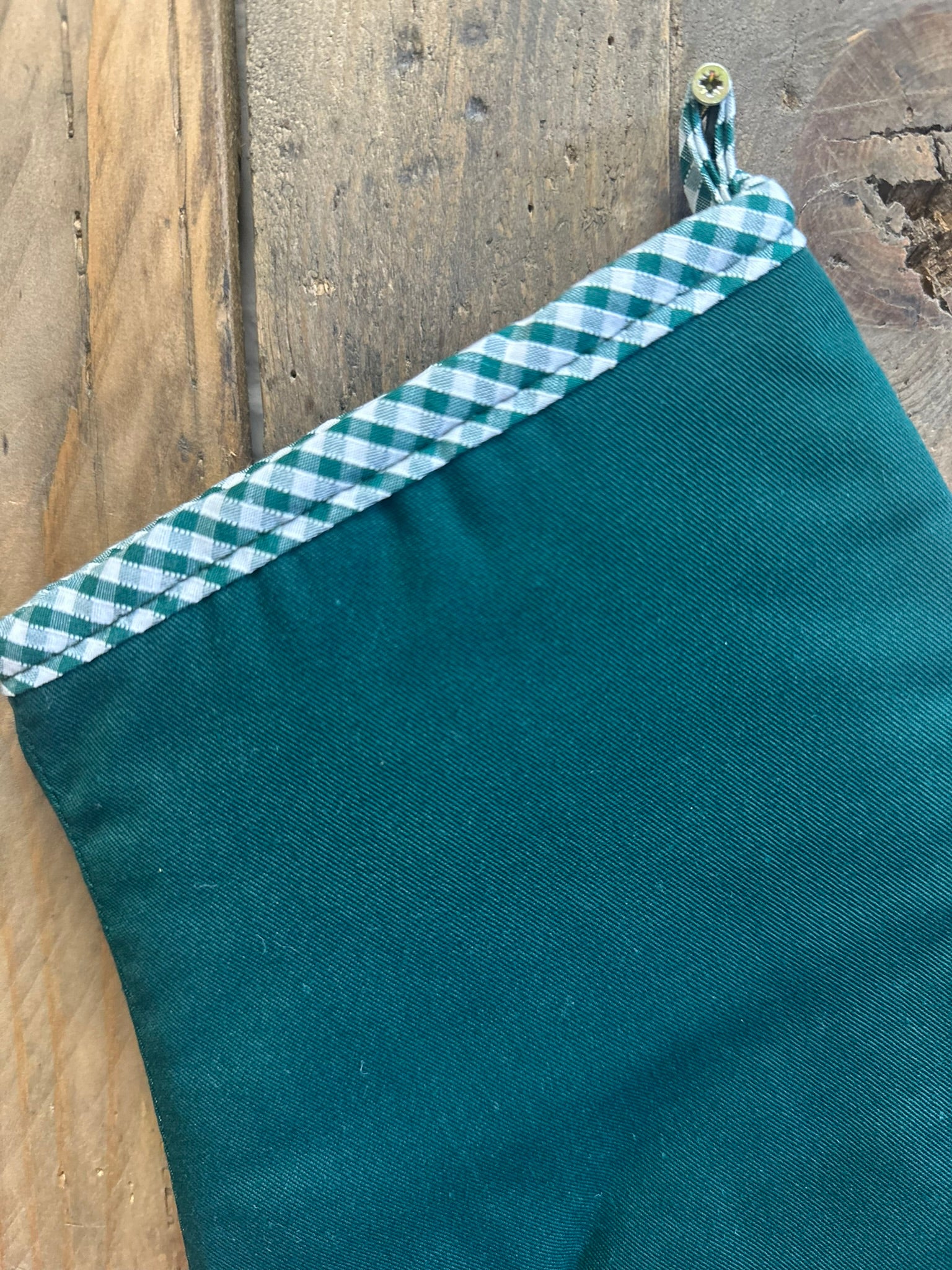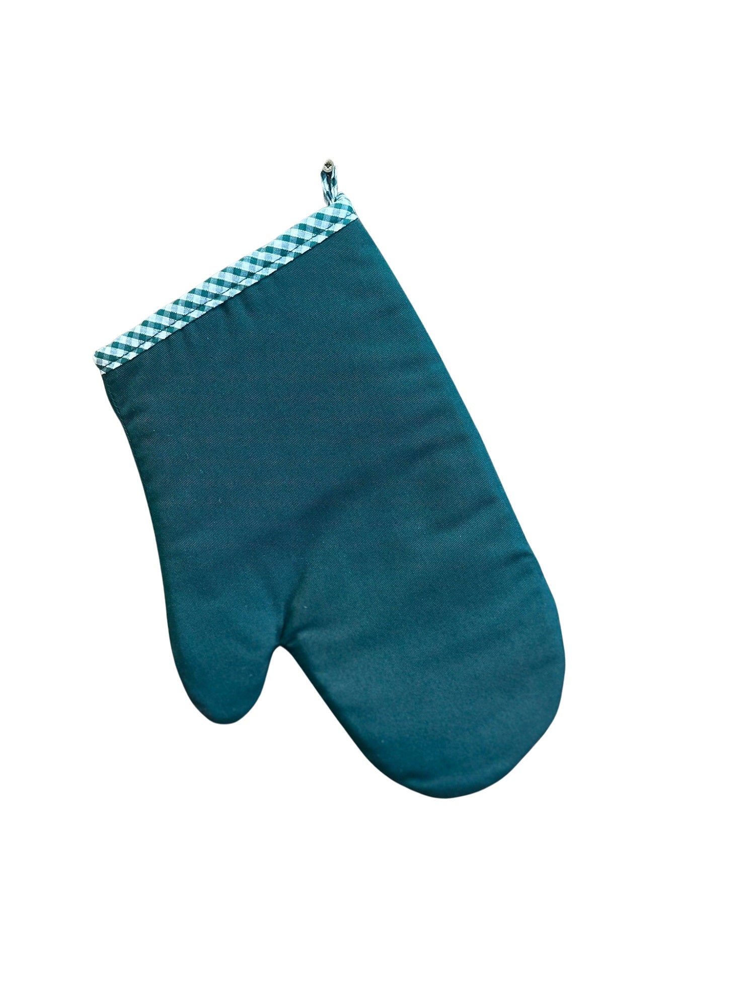These green & white gingham trim single oven gloves are quilted and have a convenient hanging loop.