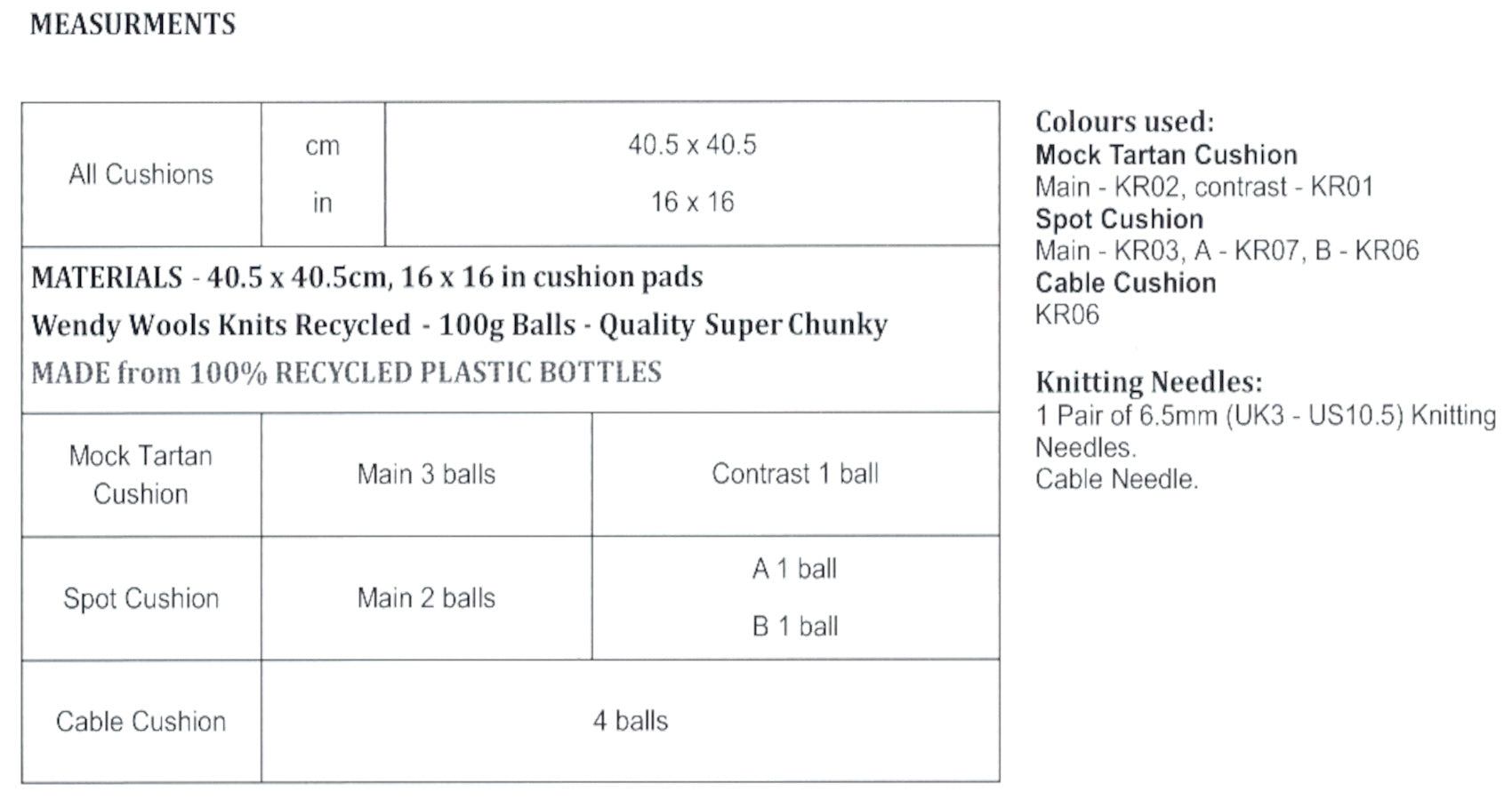 • Details: This Wendy super chunky knitting pattern instructs you how to knit a cushion cover in three designs, using Wendy Wools Knits Recycled yarn.