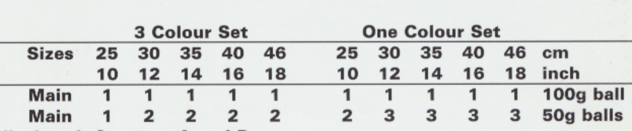 See image provided for the number of 50g/100g balls of wool required for each garment and the colours that are illustrated in the leaflet.