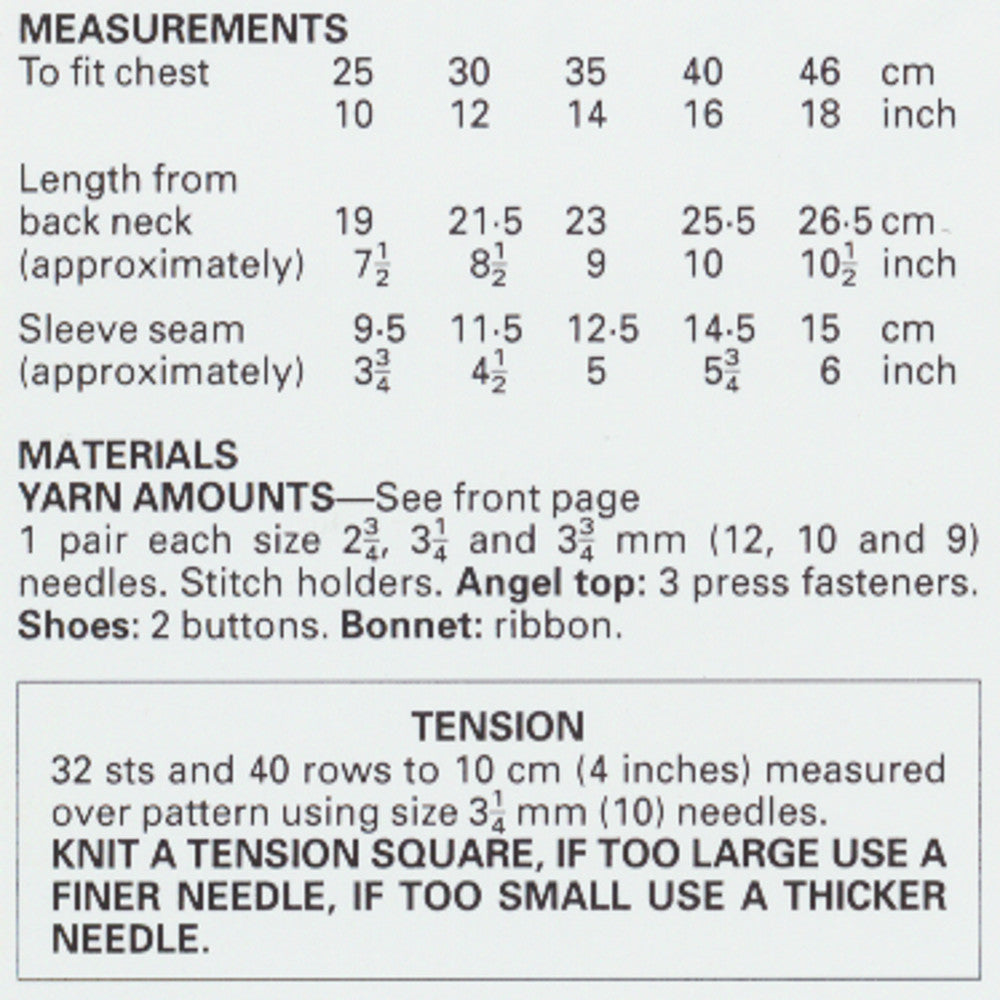 This Peter Gregory 4 ply knitting pattern leaflet 730 will instruct you on how to create a long sleeved angel top with matching hat and shoes.