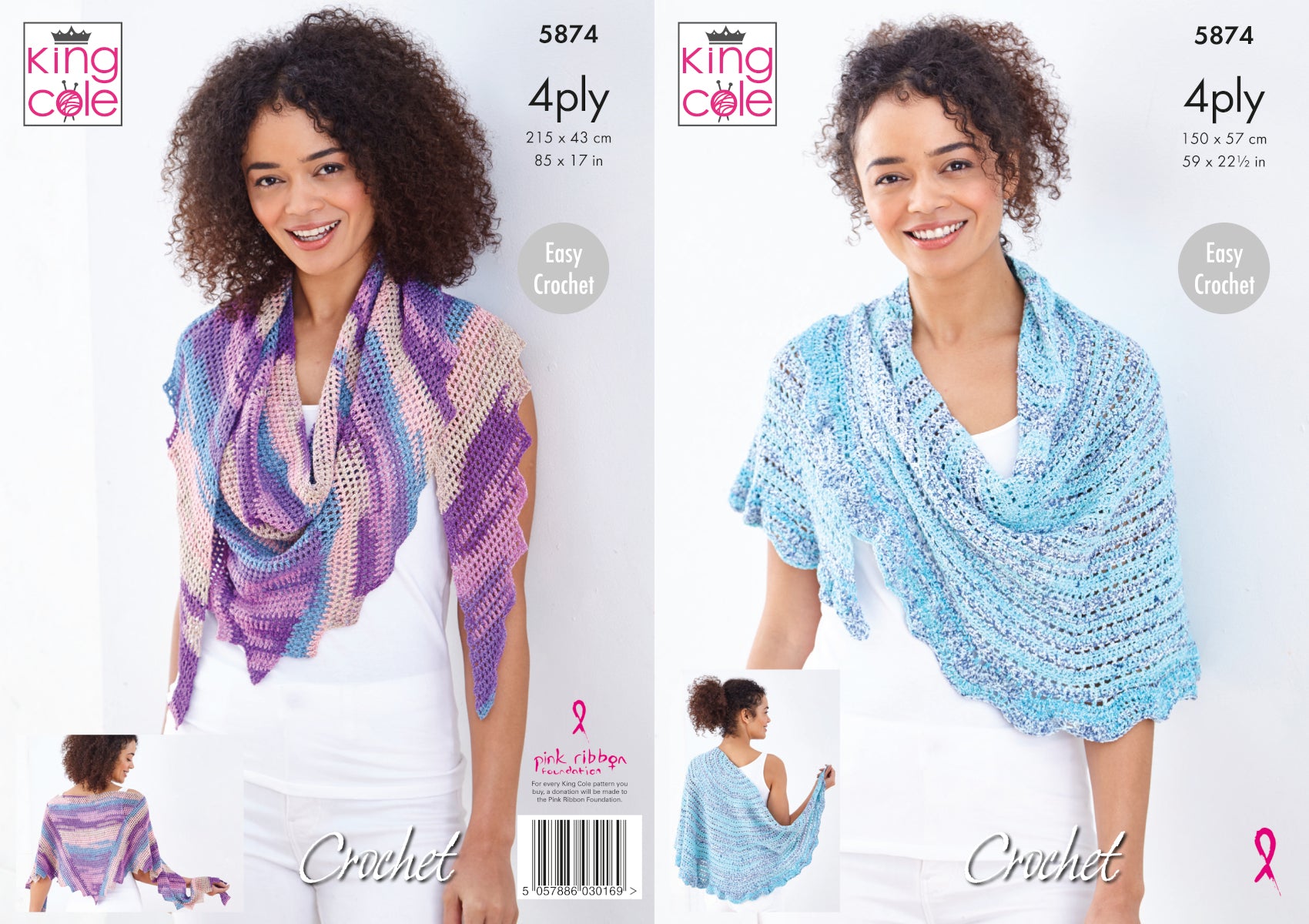 This 4ply crochet pattern leaflet 5874 by King Cole will instruct you on how to create a semi-circular and triangular shawl.