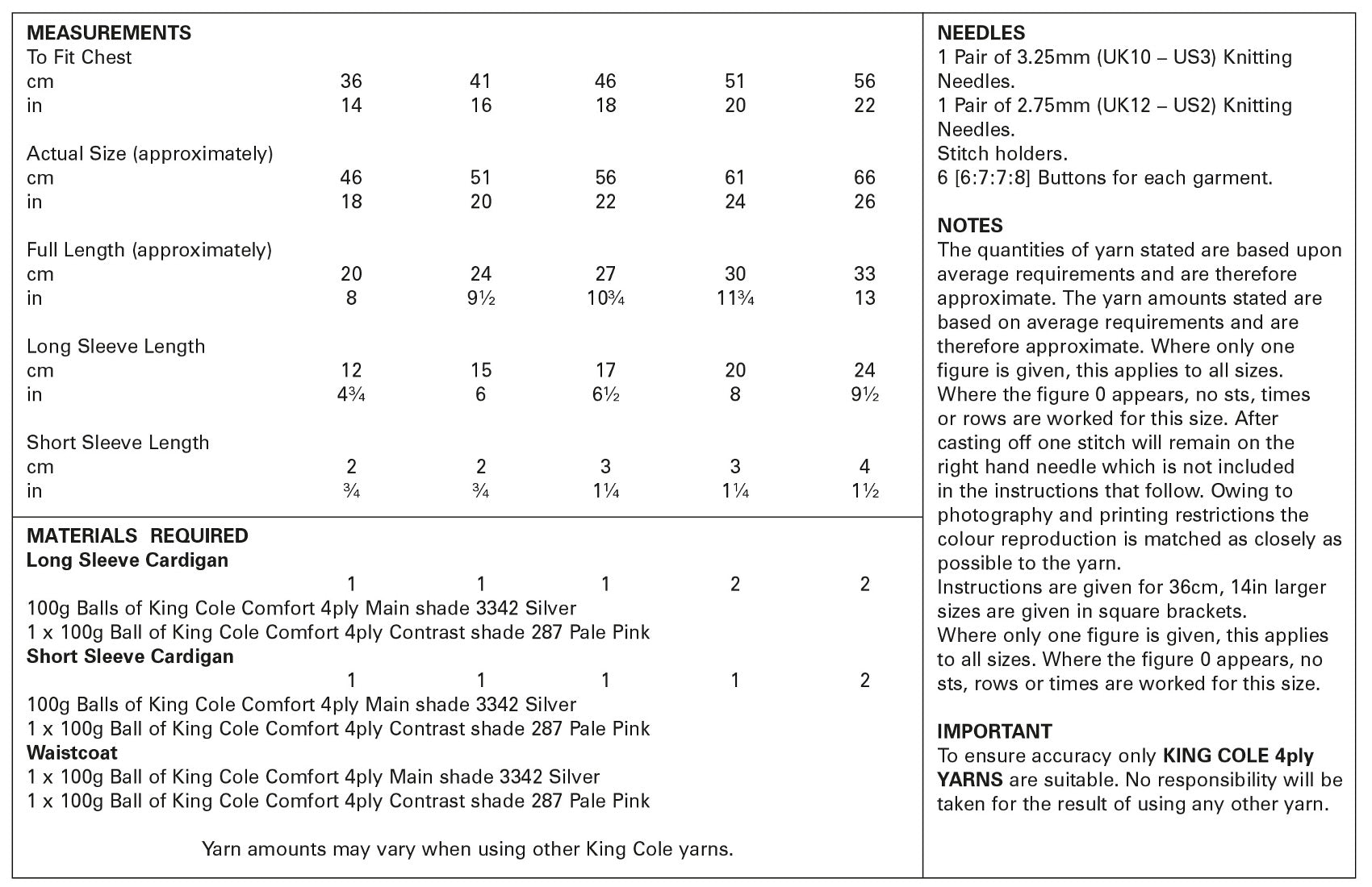 - Details: This is an easy knit King Cole baby knitting pattern that instructs you on how to knit a long or short sleeved cardigan and a waistcoat, using Comfort 4ply yarn.