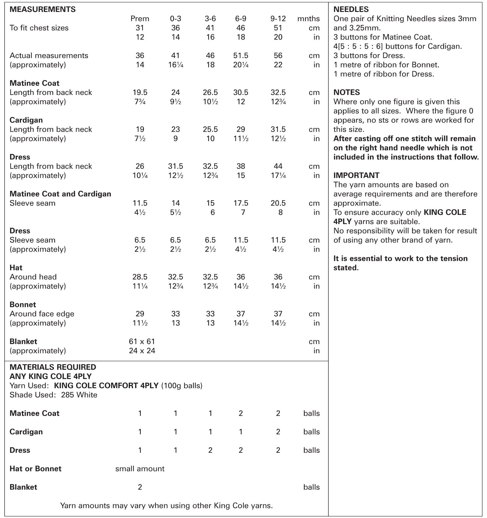 - Details: This is a King Cole baby knitting pattern that instructs you on how to knit a matinee coat, cardigan, dress, hat, bonnet and blanket, using Comfort 4ply yarn.