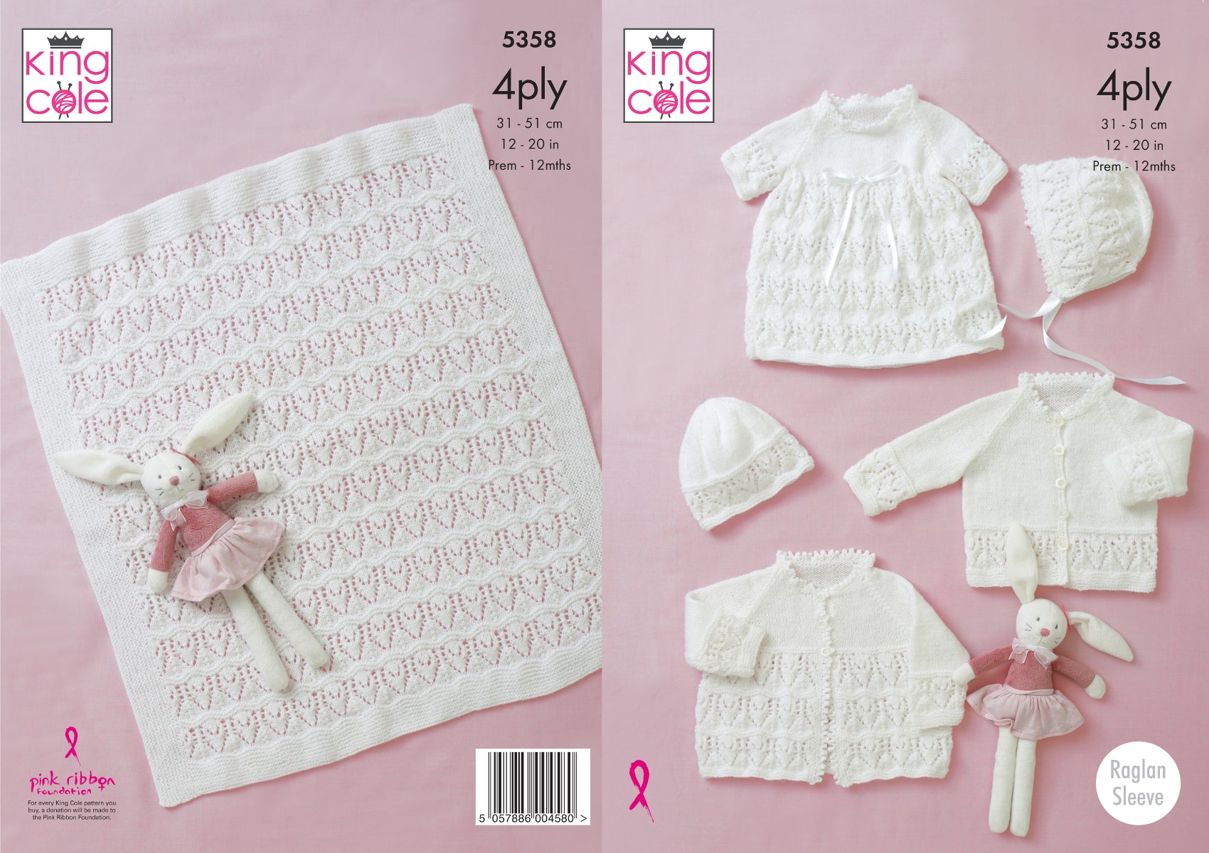 This baby 4ply knitting pattern leaflet 5358 by King Cole will instruct you on how to create a raglan sleeve matinee coat, cardigan, dress, hat, bonnet and blanket, all with lace detail.