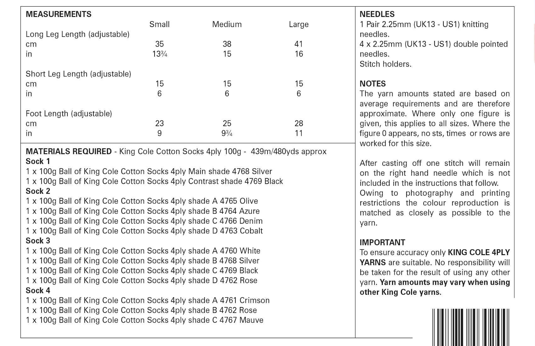 - Details: This is a King Cole 4ply knitting pattern that instructs you on how to knit ladys short or long length socks, using Cotton Socks 4ply yarn.