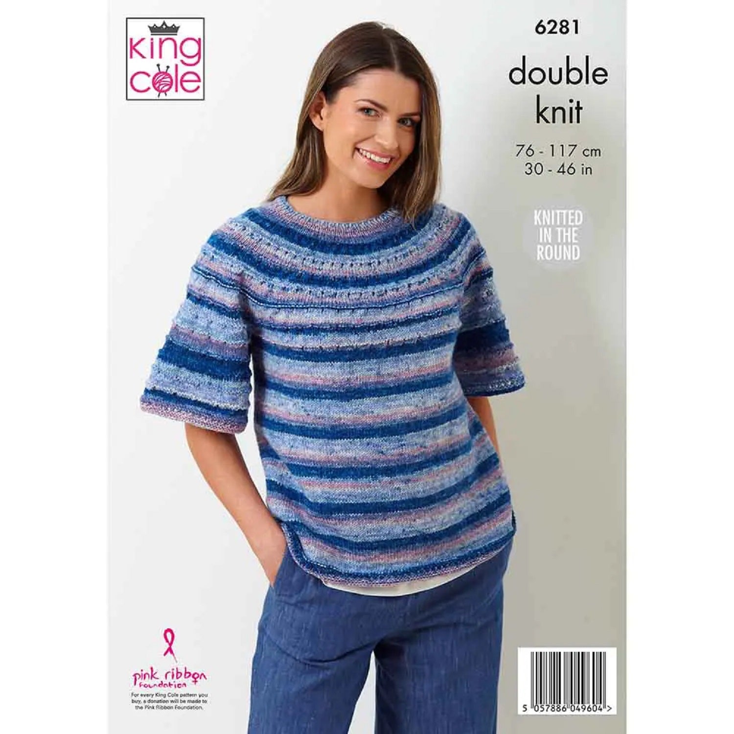 This double knit knitting pattern leaflet 6281 by King Cole will instruct you on how to create a womans knit in the round sweaters with short or long sleeves.