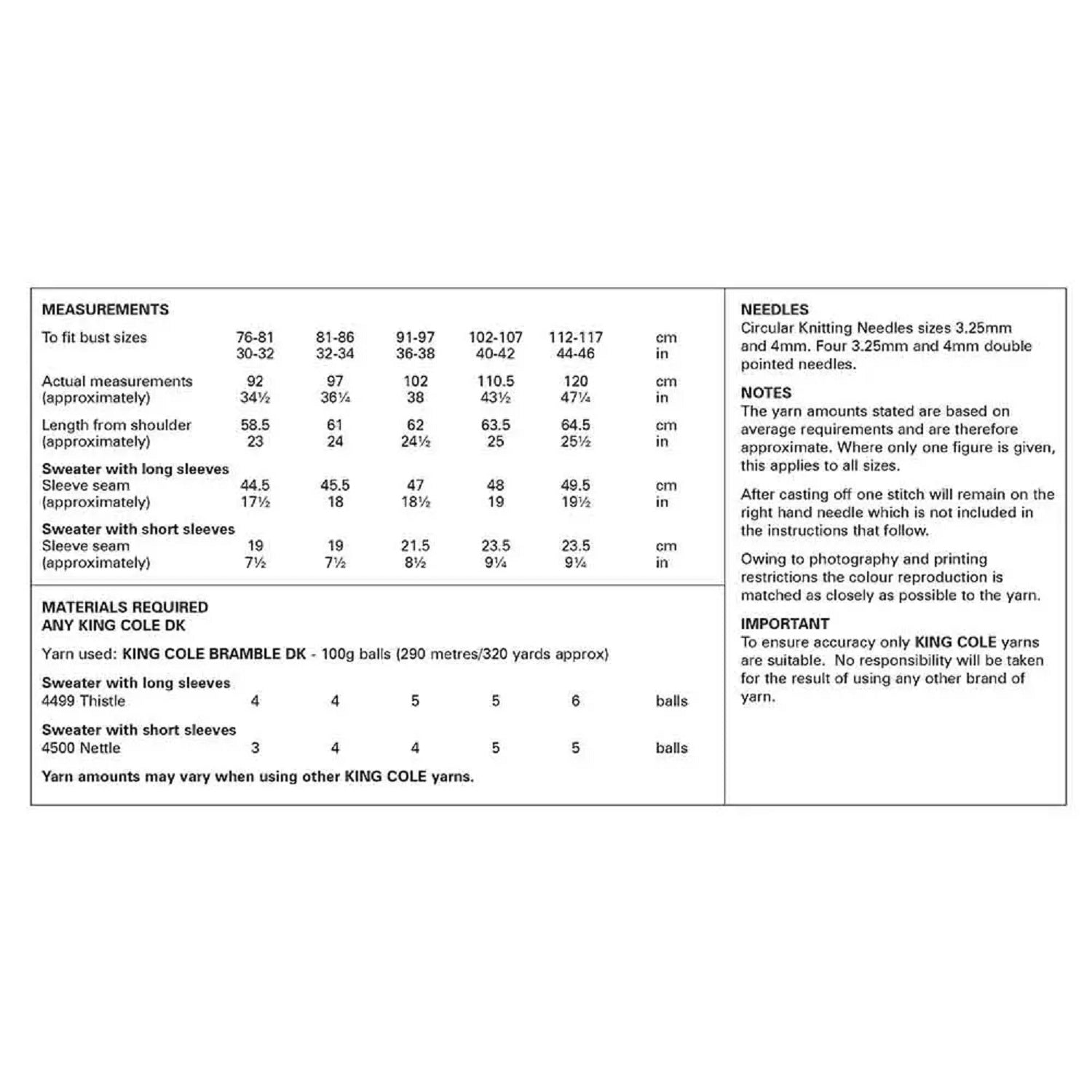 Details: This is a King Cole knitting pattern that instructs you on how to create womens knit in the round sweater with short or long arms, using Bramble DK Chunky yarn.