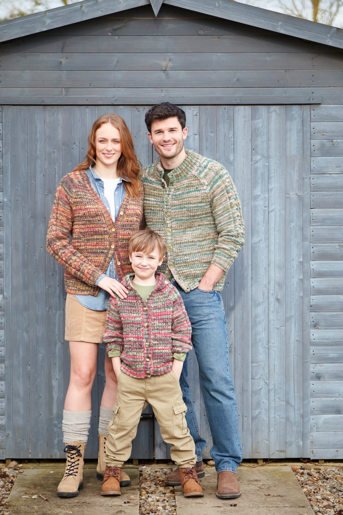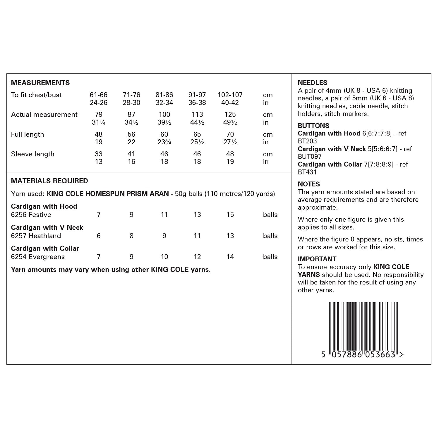 Details: This is a King Cole Aran knitting pattern that instructs you on how to knit a cardigan for all the family, using Homespun Prism Aran yarn.