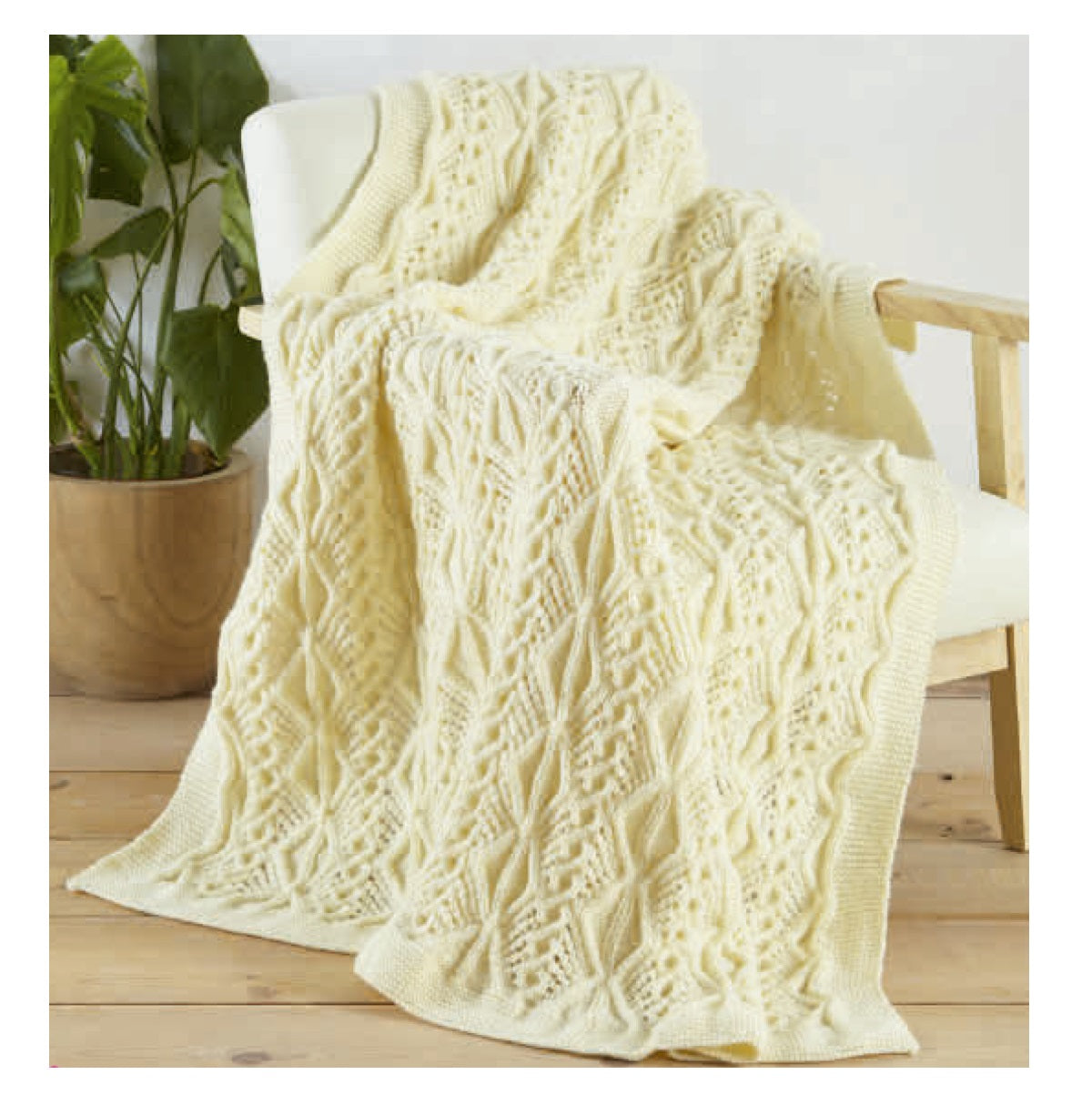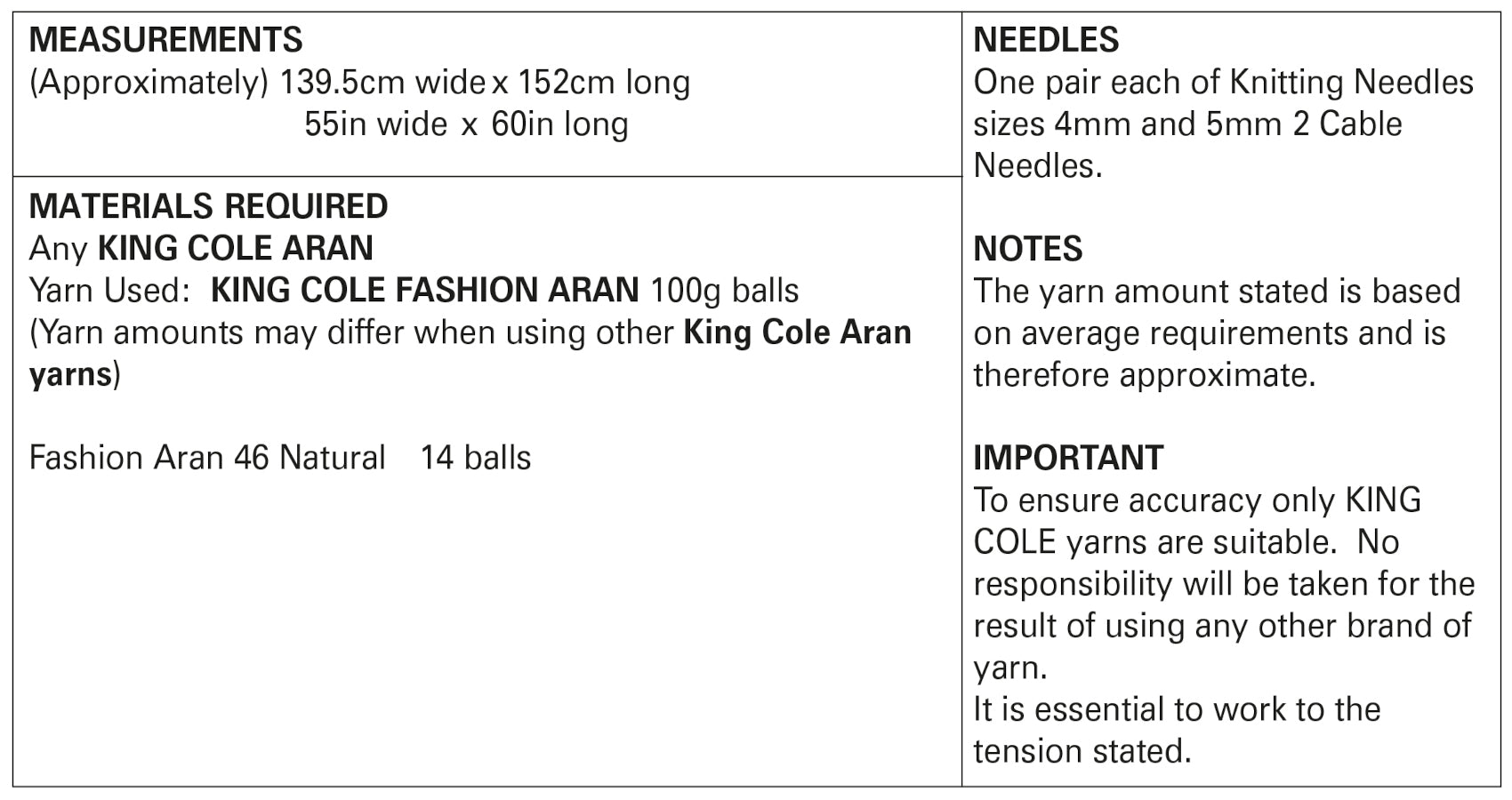 This aran knitting pattern leaflet 3458 by King Cole will instruct you on how to create a cable knit afghan throw.